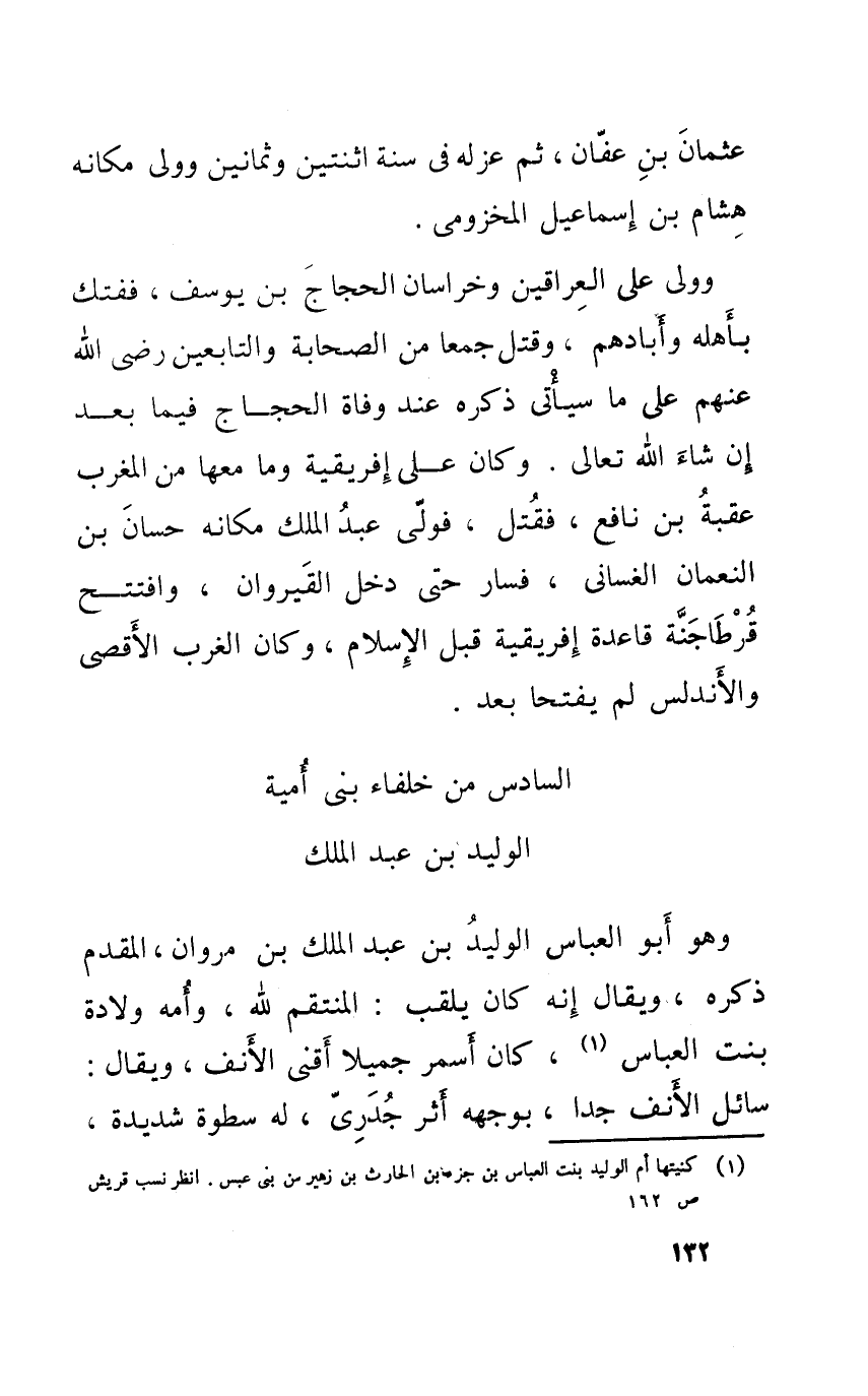 وَهُوَ أَبُو الْعَبَّاس الْوَلِيد بن عبد الْملك بن مَرْوَان الْمُقدم ذكره وَيُقَال أَنه كَانَ يلقب المنتقم لله وَأمه ولادَة بنت الْعَبَّاس كَانَ أسم أسمر جميلا أقنى الْأنف وَيُقَال سَائل الْأنف جدا بِوَجْهِهِ أثر جدرى لَهُ سطوة شَدِيدَة
