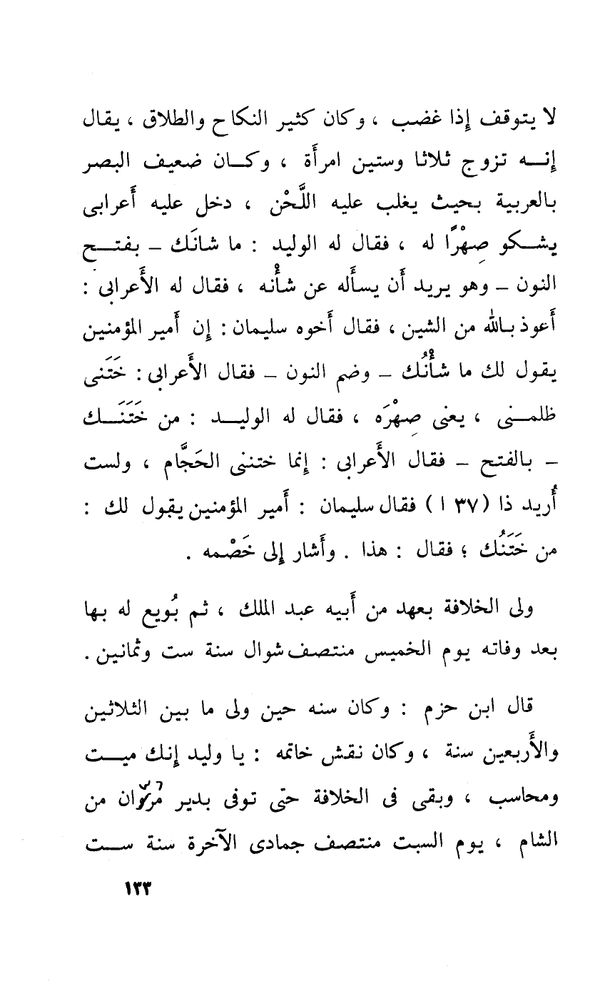 لاتتوقف إِذا غضب وَكَانَ كثير النِّكَاح وَالطَّلَاق يُقَال أَنه تزوج ثلاثأ وَسِتِّينَ امْرَأَة وَكَانَ ضَعِيف الْبَصَر بِالْعَرَبِيَّةِ بِحَيْثُ يغلب عَلَيْهِ اللّحن دخل عَلَيْهِ أَعْرَابِي يشكو صهرا لَهُ فَقَالَ الْوَلِيد مَا شَأْنك بِفَتْح النُّون وَهُوَ يُرِيد أَن يسْأَله عَن شَأْنه فَقَالَ لَهُ الْأَعرَابِي أعوذ بِاللَّه من الشين فَقَالَ أَخُوهُ سُلَيْمَان أَمِير الْمُؤمنِينَ يَقُول لَك مَا شَأْنك وَضم النُّون فَقَالَ الْأَعرَابِي ختني ظَلَمَنِي يَعْنِي صهره فَقَالَ الْوَلِيد من ختنك بِالْفَتْح فَقَالَ الْأَعرَابِي إِنَّمَا ختنني الْحجام وَلست أُرِيد ذَا (37 أ) فَقَالَ سُلَيْمَان أَمِير الْمُؤمنِينَ يَقُول لَك من ختنك فَقَالَ هَذَا وَأَشَارَ إِلَى خَصمه