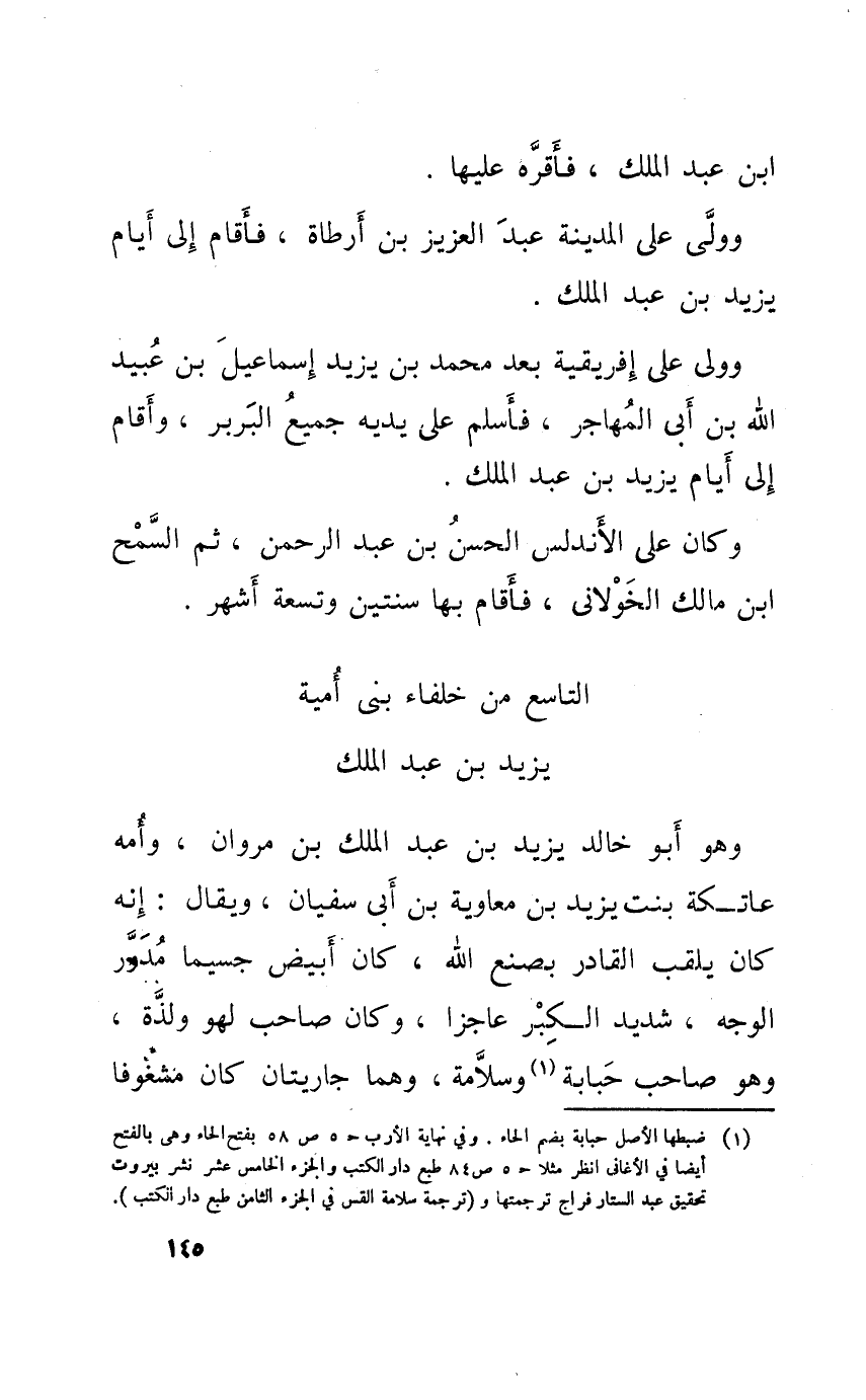 وَهُوَ ابو خَالِد يزِيد بن عبد الْملك بن مَرْوَان وامه عَاتِكَة بنت يزِيد بن مُعَاوِيَة بن ابي سُفْيَان وَيُقَال انه كَانَ يلقب الْقَادِر بصنع الله كَانَ ابيض جسيما مدور الْوَجْه شَدِيد الْكبر عَاجِزا وَكَانَ صَاحب لَهو وَلَذَّة وَهُوَ صَاحب حبابة وسلامة وهما جاريتان كَانَ مشغوفا
