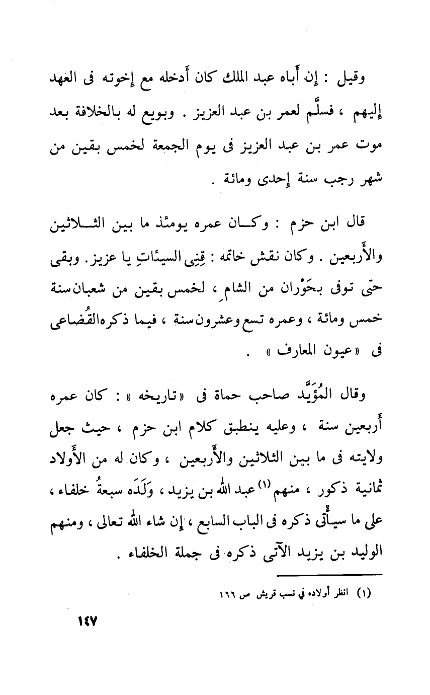 وَقَالَ الْمُؤَيد صَاحب حماة فِي تَارِيخه كَانَ عمره أَرْبَعِينَ سنة وَعَلِيهِ ينطبق كَلَام ابْن حزم حَيْثُ جعل ولَايَته فِي مَا بَين الثَّلَاثِينَ والابعين وَكَانَ لَهُ من الاولاد ثَمَانِيَة ذُكُور مِنْهُم عبد الله بن يزِيد وَلَده سَبْعَة خلفاء على مَا سَيَأْتِي ذكره فِي الْبَاب السَّابِع ان شَاءَ الله تَعَالَى وَمِنْهُم الْوَلِيد بن يزِيد الَّاتِي ذكره فِي جملَة الْخُلَفَاء