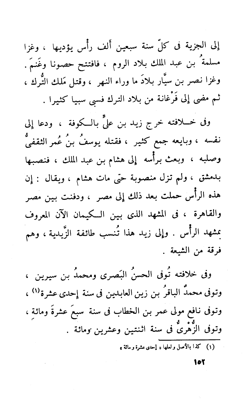 وَفِي خِلَافَته خرج زيد بن عَليّ بِالْكُوفَةِ ودعا الى نَفسه وَبَايَعَهُ جمع كثير فَقتله يُوسُف بن عمر الثَّقَفِيّ وصلبه وَبعث بِرَأْسِهِ الى هِشَام بن عبد الْملك فنصبها بِدِمَشْق وَلم تزل مَنْصُوبَة حَتَّى مَاتَ هِشَام وَيُقَال ان هَذِه الرَّأْس حملت بعد ذَلِك الى مصر ودفنت بَين مصر والقاهرة فِي المشهد الَّذِي بَين الكيمان الان الْمَعْرُوف بمشهد الرَّأْس والى زيد هَذَا تنْسب طَائِفَة الزيدية وهم فرقة من الشِّيعَة