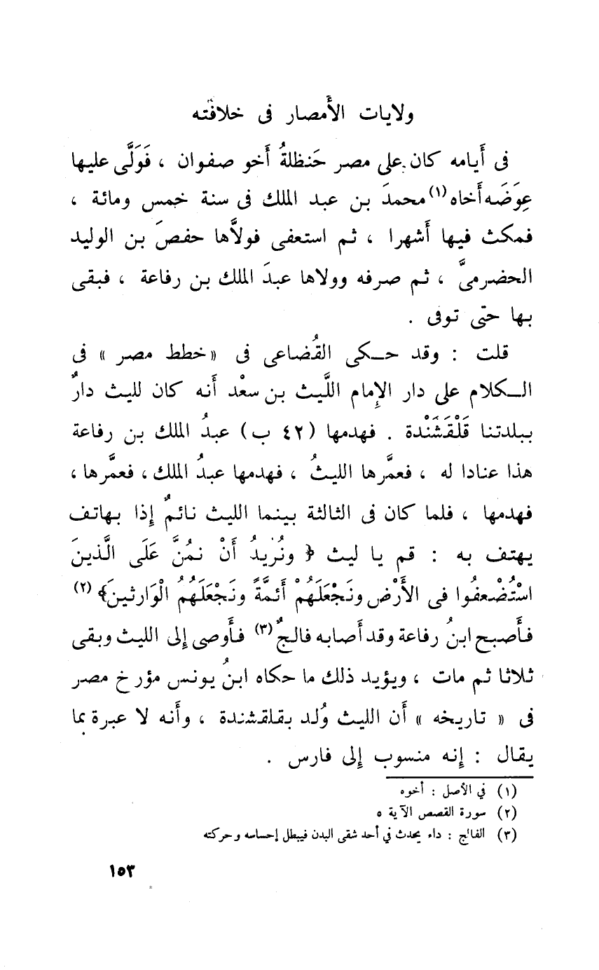 قلت وَقد حكى الْقُضَاعِي فِي خطط مصر فِي الْكَلَام على دَار الامام اللَّيْث بن سعد انه كَانَ لليث دَار ببلدتنا قلقشندة فَهَدمهَا 42 ب عبد الْملك بن رِفَاعَة هَذَا عنادا لَهُ فعمرها اللَّيْث فَهَدمهَا عبد الْملك فعمرها فَهَدمهَا فَلَمَّا كَانَ فِي الثَّالِثَة بَيْنَمَا اللَّيْث نَائِم اذا بهاتف يَهْتِف بِهِ قُم يَا لَيْث {ونريد أَن نمن على الَّذين استضعفوا فِي الأَرْض ونجعلهم أَئِمَّة ونجعلهم الْوَارِثين} فَأصْبح ابْن رِفَاعَة وَقد اصابه فالج فأوصى الى اللَّيْث وَبَقِي ثَلَاثًا ثمَّ مَاتَ وَيُؤَيّد ذَلِك مَا حَكَاهُ ابْن يُونُس مؤرخ مصر فِي تَارِيخه ان اللَّيْث ولد بقلقشندة وانه لَا عِبْرَة بِمَا يُقَال انه مَنْسُوب الى فَارس
