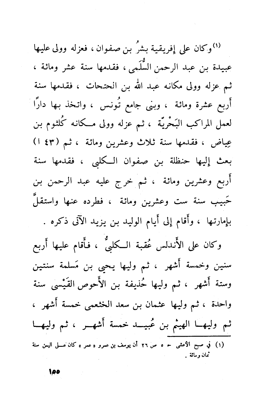 وَكَانَ على افريقية بشر بن صَفْوَان فَعَزله وَولى عَلَيْهَا عُبَيْدَة بن عبد الرَّحْمَن السّلمِيّ فَقَدمهَا سنة عشر وَمِائَة ثمَّ عَزله وَولى مَكَانَهُ عبد الله بن الحتحات فَقَدمهَا سنة ارْبَعْ عشر وَمِائَة وَبنى جَامع تونس وَاتخذ بهَا دَارا لعمل المراكب البحرية ثمَّ عَزله وَولى مَكَانَهُ كُلْثُوم بن عِيَاض فَقَدمهَا سنة ثَلَاث وَعشْرين وَمِائَة ثمَّ 43 أبْعث اليها حَنْظَلَة بن صَفْوَان الْكَلْبِيّ فَقَدمهَا سنة ارْبَعْ وَعشْرين وَمِائَة ثمَّ خرج عَلَيْهِ عبد الرَّحْمَن بن حبيب سنة سِتّ وَعشْرين وَمِائَة فطرده عَنْهَا واستقل بامارتها وَأقَام الى ايام الْوَلِيد بن يزِيد الَّاتِي ذكره