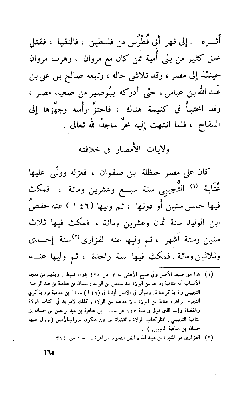 كَانَ على مصر حَنْظَلَة بن صَفْوَان فَعَزله وَولى عَلَيْهَا عتابة التجِيبِي سنة سبع وَعشْرين وَمِائَة فَمَكثَ فِيهَا خمس سِنِين اَوْ دونهمَا ثمَّ وَليهَا 46 أعنه حَفْص ابْن الْوَلِيد سنة ثَمَان وَعشْرين وَمِائَة فَمَكثَ فِيهَا ثَلَاث سِنِين وَسِتَّة اشهر ثمَّ وَليهَا عَنهُ الْفَزارِيّ سنة احدى وَثَلَاثِينَ وَمِائَة فَمَكثَ فِيهَا سنة وَاحِدَة ثمَّ وَليهَا عَنهُ