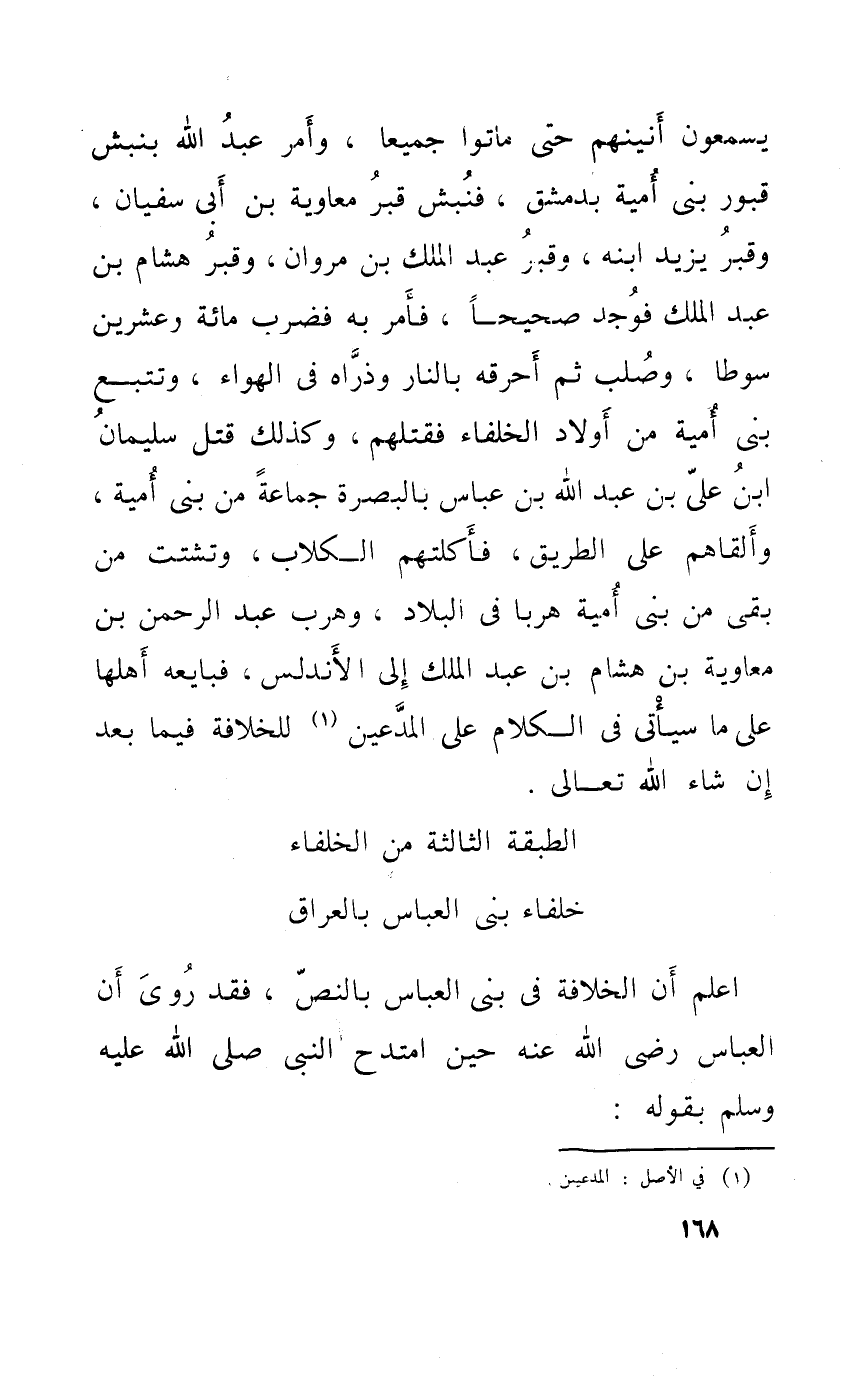 يسمعُونَ انينهم حَتَّى مَاتُوا جَمِيعًا وامر عبد الله بنبش قُبُور بني امية بِدِمَشْق فنبش قبر مُعَاوِيَة بن ابي سُفْيَان وقبر يزِيد ابْنه وقبر عبد الْملك بن مَرْوَان وقبر هِشَام بن عبد الْملك فَوجدَ صَحِيحا فَأمر بِهِ فَضرب مائَة وَعشْرين سَوْطًا وصلب ثمَّ احرقه بالنَّار وذراه فِي الْهَوَاء وتتبع بني امية من اولاد الْخُلَفَاء فَقَتلهُمْ وَكَذَلِكَ قتل سُلَيْمَان ابْن عَليّ بن عبد الله بن عَبَّاس بِالْبَصْرَةِ جمَاعَة من بني امية والقاهم على الطَّرِيق فأكلتهم الْكلاب وتشتت من بَقِي من بني امية هربا فِي الْبِلَاد وهرب عبد الرَّحْمَن بن مُعَاوِيَة بن هِشَام بن عبد الْملك الى الاندلس فَبَايعهُ اهلها على مَا سَيَأْتِي فِي الْكَلَام على المدعين للخلافة فِيمَا بعد ان شَاءَ الله تَعَالَى