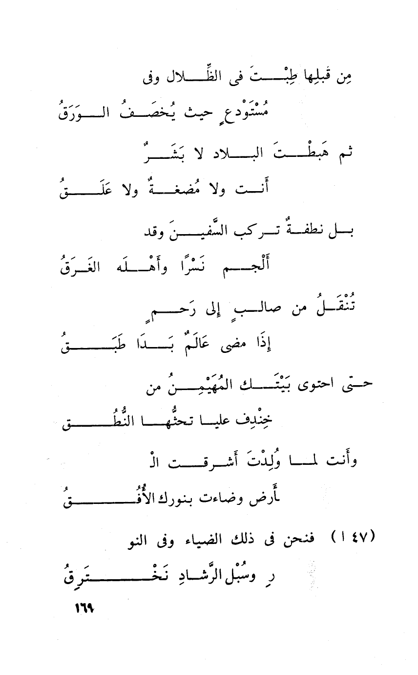 .. من قبلهَا طبت فِي الظلال وَفِي ... مستودع حَيْثُ يخصف الْوَرق ... ثمَّ هَبَطت الْبِلَاد لَا بشر ... انت وَلَا مُضْغَة وَلَا علق ... بل نُطْفَة تركب السفين وَقد ... الجم نسرا واهله الْغَرق ... تنقل من صالب الى رحم ... اذا مضى عَالم بدا طبق ... حَتَّى احتوى بَيْتك الْمُهَيْمِن من ... خَنْدَق عَلَيْهَا تحثها النُّطْق ... وانت لما ولدت اشرقت ال ... أَرض وضاءت بنورك الافق ... 47 أفنحن فِي ذَلِك الضياء وَفِي النو ... ر وسبل الرشاد نخترق ...
