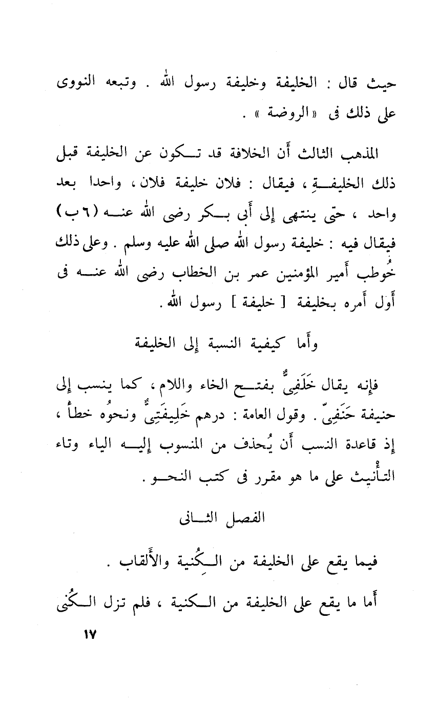 الْمَذْهَب الثَّالِث أَن الْخلَافَة قد تكون عَن الْخَلِيفَة قبل ذَلِك الْخَلِيفَة فَيُقَال فلَان خَليفَة فلَان وَاحِد بعد وَاحِد حَتَّى ينتهى إِلَى أبي بكر رَضِي الله عَنهُ (6 ب) فَيُقَال فِيهِ خَليفَة رَسُول الله صلى الله علية وَسلم وعَلى ذَلِك خُوطِبَ أَمِير الْمُؤمنِينَ عمر بن الْخطاب رَضِي الله عَنهُ فِي أول أمره بخليفة (خَليفَة) رَسُول الله