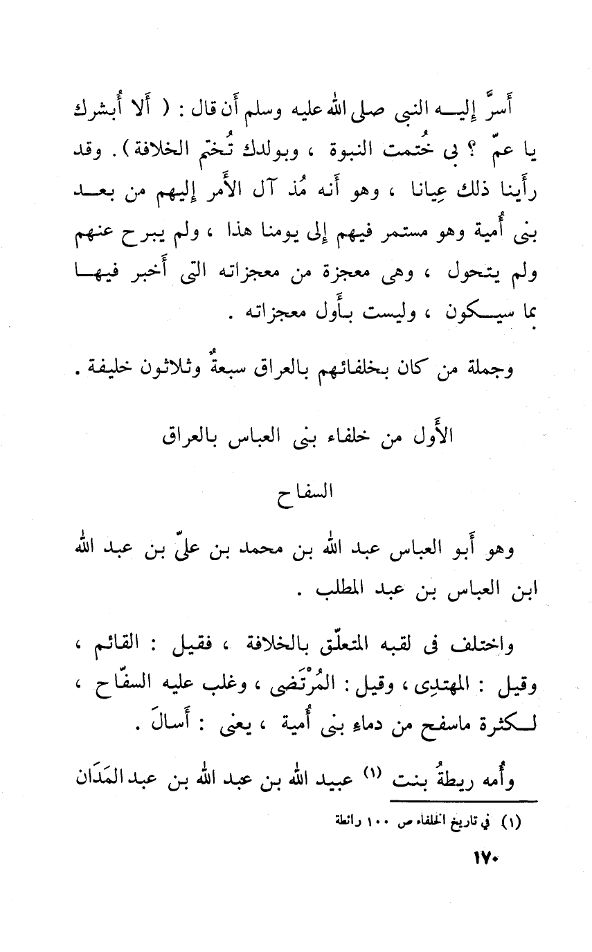 اسر اليه النَّبِي صلى الله عَلَيْهِ وَسلم ان قَالَ الا ابشرك يَا عَم بِي ختمت النبوه وبولدك تختم الْخلَافَة وَقد رَأينَا ذَلِك عيَانًا وَهُوَ أَنه مذ آل الامر اليهم من بعد بني امية وَهُوَ مُسْتَمر فيهم الى يَوْمنَا هَذَا وَلم يبرح عَنْهُم وَلم يتَحَوَّل وَهِي معْجزَة من معجزاته الَّتِي اخبر فِيهَا بِمَا سَيكون وَلَيْسَت بِأول معجزاته