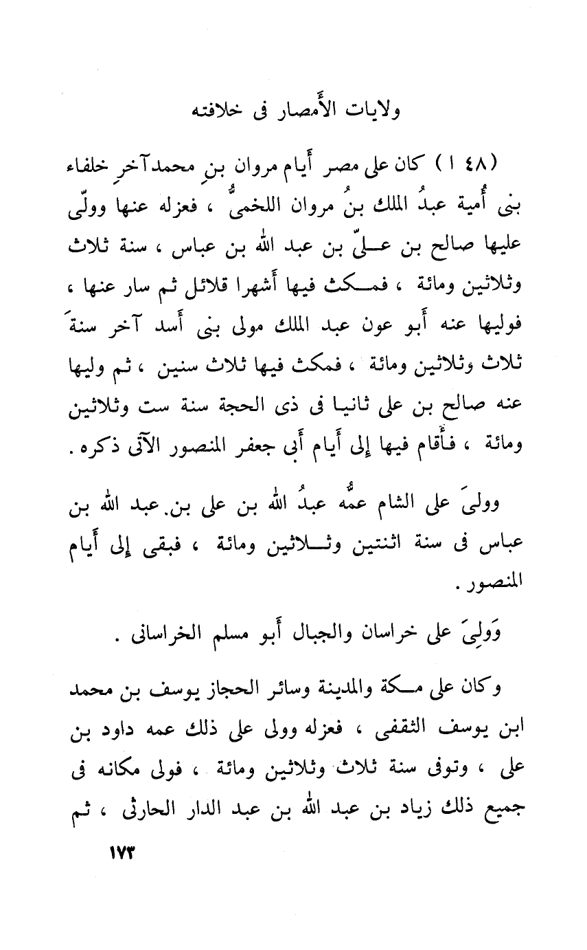 (48 أ) كَانَ على مصر أَيَّام مَرْوَان بن مُحَمَّد آخر خلفاء بنى أُميَّة عبد الْملك بن مَرْوَان اللخمى فَعَزله عَنْهَا وَولى عَلَيْهَا صَالح بن على بن عبد الله بن عَبَّاس سنة ثَلَاث وَثَلَاثِينَ ومائه فَمَكثَ فِيهَا أشهر قَلَائِل ثمَّ سَار عَنْهَا فوليا عَنهُ أَبُو عون عبد الْملك مولى بنى أَسد آخر سنة ثَلَاث وَثَلَاثِينَ ومائه فَمَكثَ فِيهَا ثَلَاث سِنِين ثمَّ وَليهَا عَنهُ صَالح بن على ثَانِيًا فِي ذى الْحجَّة سنة سِتّ وَثَلَاثِينَ وَمِائَة فَأَقَامَ فِيهَا إِلَى أَيَّام أبي جَعْفَر المنصورالآتي ذكره