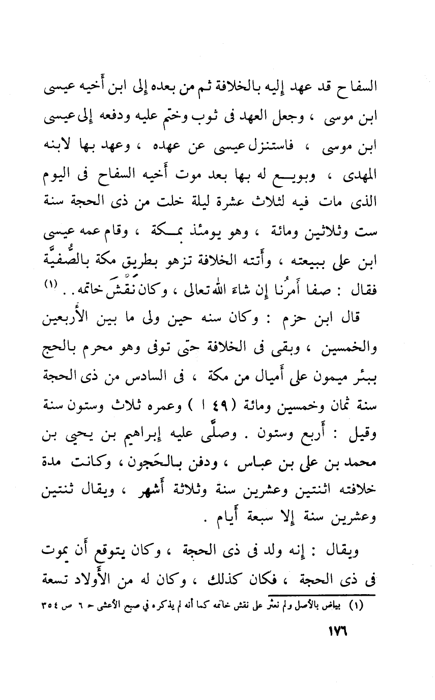 السفاح قد عهد إِلَيْهِ بالخلافة ثمَّ من بعده إِلَى ابْن أَخِيه عِيسَى ابْن مُوسَى وَجعل الْعَهْد فِي ثوب وَختم عَلَيْهِ وَدفعه إِلَى عِيسَى ابْن مُوسَى فاستنزل عِيسَى عَن عَهده وعهد بهَا لِابْنِهِ المهدى وبويع لَهُ بهَا بعد موت أَخِيه السفاح فِي الْيَوْم الذى مَاتَ فِيهِ لثلاث عشرَة لَيْلَة خلت من ذى الْحجَّة سنة سِتّ وَثَلَاثِينَ وَمِائَة وَهُوَ يَوْمئِذٍ بِمَكَّة وَقَامَ عَمه عِيسَى ابْن على ببيعته وأتته الْخلَافَة تزهو بطرِيق مَكَّة بالصفية فَقَالَ صفا أمرنَا إِلَى شَاءَ الله تَعَالَى وَكَانَ نقش خَاتمه