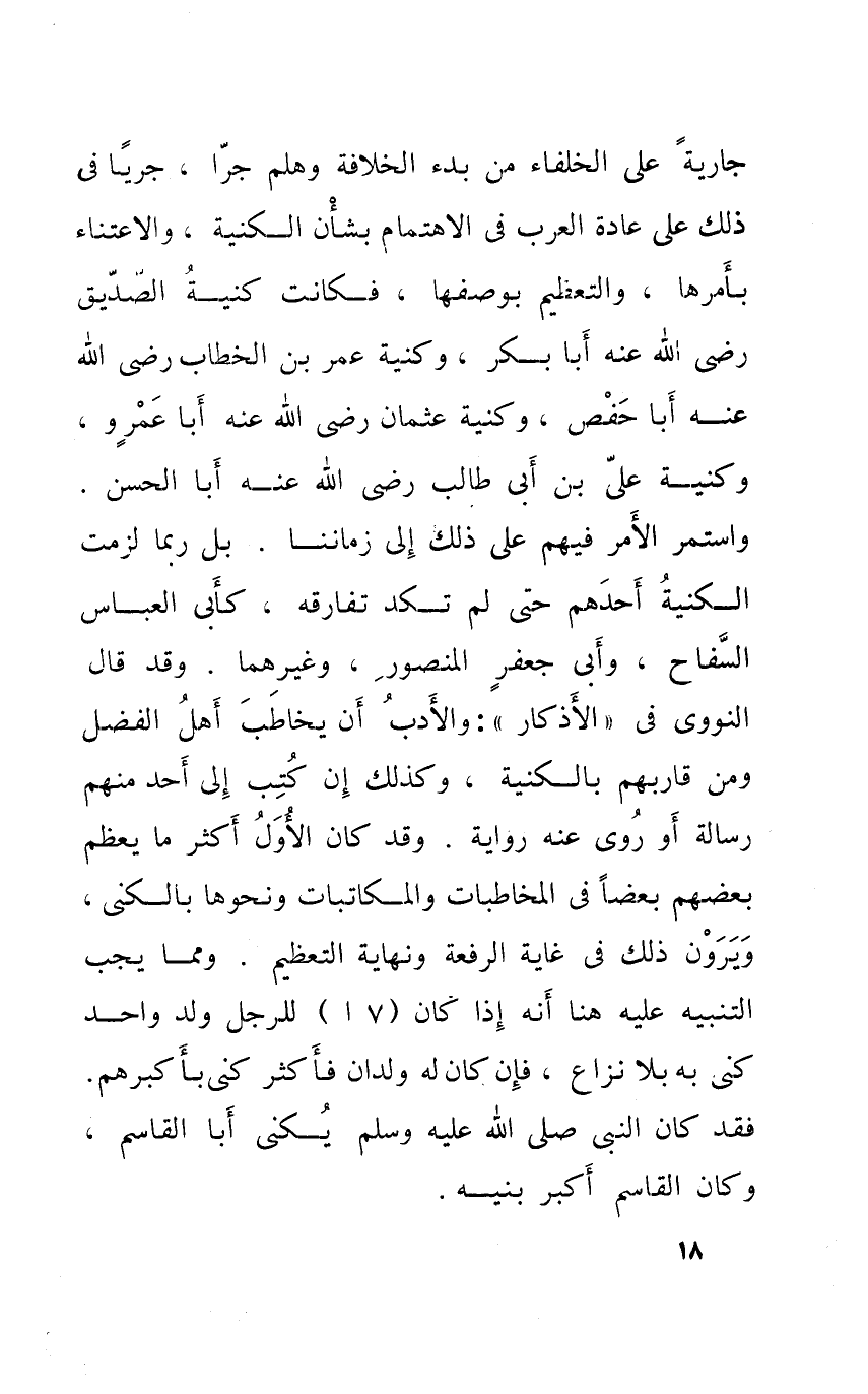 جَارِيَة على الْخُلَفَاء من بَدْء الْخلَافَة وهلم جرا جَريا فِي ذَلِك على عَادَة الْعَرَب فِي الاهتمام بشأن الكنية والاعتناء بأمرها والتعظيم بوصفها فَكَانَت كنية الصّديق رَضِي الله عَنهُ أَبَا بكر وكنية عمر بن الْخطاب رضى الله عَنهُ أَبَا حَفْص وكنية عُثْمَان رَضِي الله عَنهُ أَبَا عَمْرو وكنية عَليّ بن أبي طَالب رَضِي الله عَنهُ أَبَا الْحسن وَاسْتمرّ الْأَمر فيهم على ذَلِك إِلَى زَمَاننَا بل رُبمَا لَزِمت الكنية أحدهم حَتَّى لم تكد تُفَارِقهُ كَأبي الْعَبَّاس السفاح وَأبي جَعْفَر الْمَنْصُور وَغَيرهمَا وَقد قَالَ النووى فِي الْأَذْكَار وَالْأَدب أَن يُخَاطب أهل الْفضل وَمن قاربهم بالكنية وَكَذَلِكَ إِن كتب إِلَى أحد مِنْهُم رِسَالَة أَو روى عَنهُ رِوَايَة وَقد كَانَ الأول أَكثر مَا يعظم بَعضهم بَعْضًا فِي المخاطبات والمكاتبات وَنَحْوهَا بالكنى ويرون ذَلِك فِي غَايَة الرّفْعَة وَنِهَايَة التَّعْظِيم وَمِمَّا يجب التَّنْبِيه عَلَيْهِ هُنَا أَنه إِذا كَانَ (7 ا) للرجل ولد وَاحِد كنى بِهِ بِلَا نزاع فَإِن كَانَ لَهُ ولدان فَأكْثر كنى بأكبرهم فقد كَانَ النَّبِي صلى الله عَلَيْهِ وَسلم يكنى أَبَا الْقَاسِم وَكَانَ الْقَاسِم أكبر بنيه