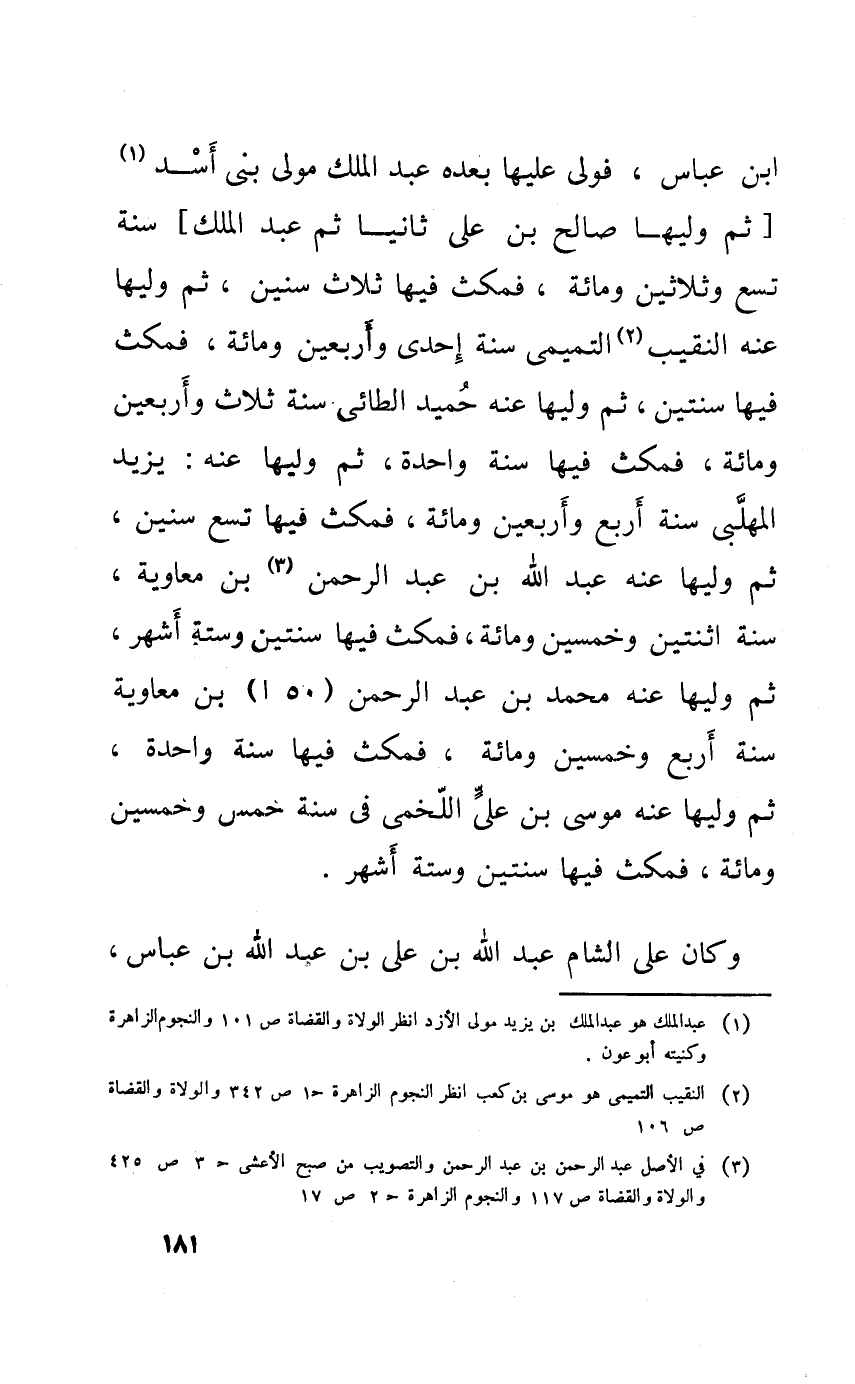 ابْن عَبَّاس فولى عَلَيْهَا بعده عبد الْملك مولى بنى أَسد ثمَّ وَليهَا صَالح بن عَليّ ثَانِيًا ثمَّ عبد الْملك سنة تسع وَثَلَاثِينَ وَمِائَة فَمَكثَ فِيهَا ثَلَاث سِنِين ثمَّ وَليهَا عَنهُ النَّقِيب التَّمِيمِي سنة إِحْدَى وَأَرْبَعين وَمِائَة فَمَكثَ فِيهَا سنتَيْن ثمَّ وَليهَا عَنهُ حميد الطائى سنة ثَلَاث وأبعين وَمِائَة فَمَكثَ فِيهَا سنة وَاحِدَة ثمَّ وَليهَا عَنهُ يزِيد المهلبي سنة أَربع وَأَرْبَعين وَمِائَة فَمَكثَ فِيهَا تسع سِنِين ثمَّ وَليهَا اثْنَيْنِ وَخمسين وَمِائَة فَمَكثَ فِيهَا سنتَيْن وَسِتَّة أشهر ثمَّ وَليهَا عَنهُ مُحَمَّد بن عبد الرَّحْمَن (50 أ) بن مُعَاوِيَة سنة أَربع وَخمسين وَمِائَة فَمَكثَ فِيهَا سنة وَاحِدَة ثمَّ وَليهَا عَنهُ مُوسَى بن عَليّ اللَّخْمِيّ فِي سنة خمس وَخمسين وَمِائَة فَمَكثَ فِيهَا وَسِتَّة أشهر