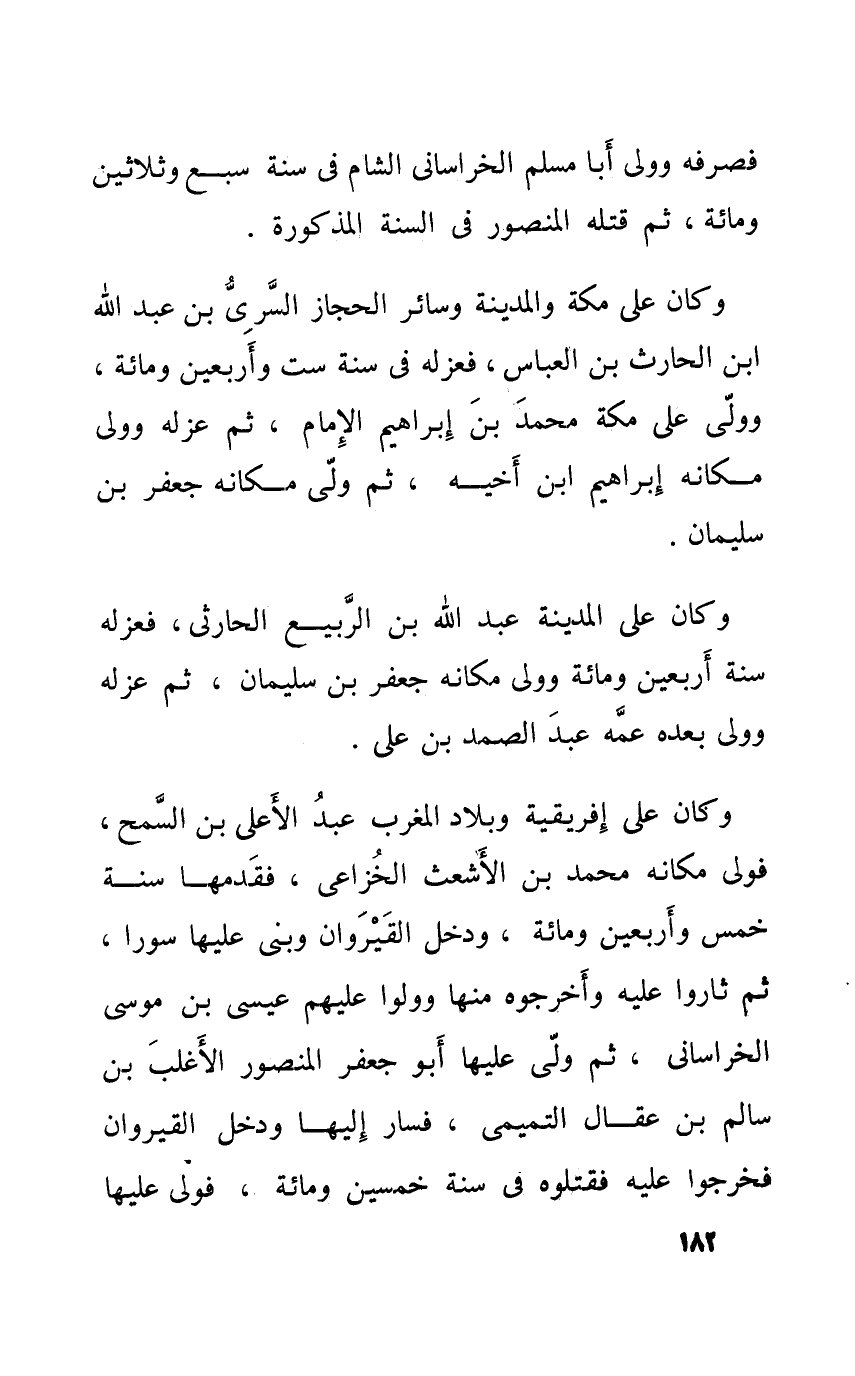 وَكَانَ على مَكَّة وَالْمَدينَة وَسَائِر الْحجاز السّري بن عبد الله ابْن الْحَارِث بن الْعَبَّاس فَعَزله فِي سنة سِتّ وَأَرْبَعين وَمِائَة وَولى على مَكَّة مُحَمَّد بن إِبْرَاهِيم الإِمَام ثمَّ عَزله وَولى مَكَانَهُ إِبْرَاهِيم ابْن أَخِيه ثمَّ ولى مَكَانَهُ جَعْفَر بن سُلَيْمَان
