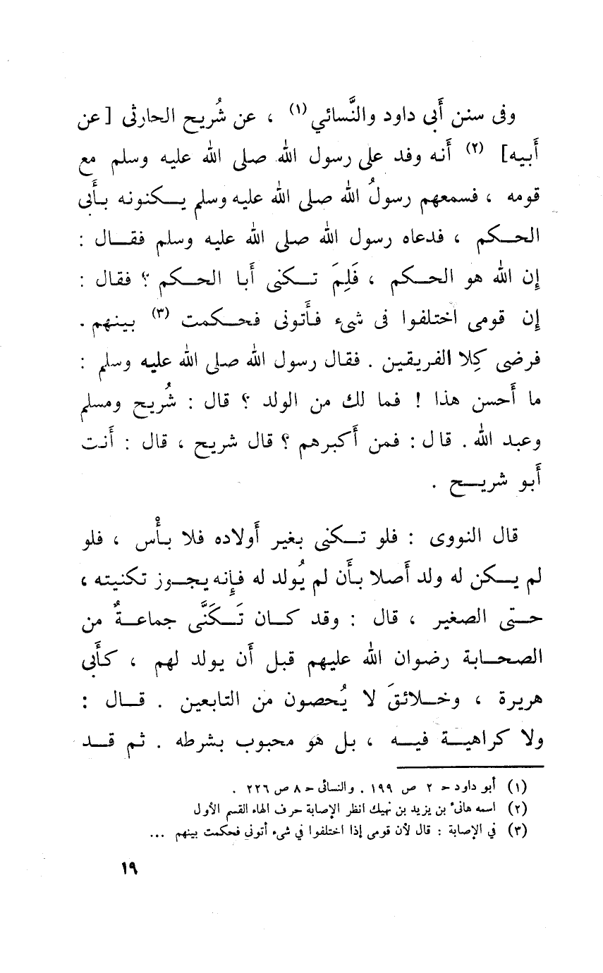 وَفِي سنَن أبي دَاوُد وَالنَّسَائِيّ عَن شُرَيْح الْحَارِثِيّ عَن أَبِيه أَنه وَفد على رَسُول الله صلى الله عَلَيْهِ وَسلم مَعَ قومه فسمعهم رَسُول الله صلى الله عَلَيْهِ وَسلم يكنونه بِأبي الحكم فَدَعَاهُ رَسُول الله صلى الله عَلَيْهِ وَسلم فَقَالَ إِن الله هُوَ الحكم فَلم تكنى أَبَا الحكم فَقَالَ إِن قومِي اخْتلفُوا فِي شَيْء فأتوني فحكمت بَينهم فرضى كلا الْفَرِيقَيْنِ فَقَالَ رَسُول الله صلى الله عَلَيْهِ وَسلم مَا احسن هَذَا فَمَا لَك من الْوَلَد قَالَ شُرَيْح وَمُسلم وَعبد الله قَالَ فَمن أكبرهم قَالَ شُرَيْح قَالَ أَنْت أَبُو شُرَيْح