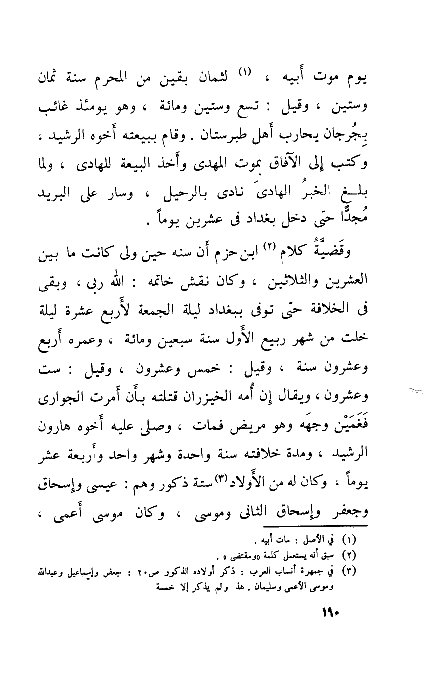 وَقَضِيَّة كَلَام ابْن حزم أَن سنه حِين ولى كَانَت مَا بَين الْعشْرين وَالثَّلَاثِينَ وَكَانَ نقش خَاتمه الله رَبِّي وبقى فِي الْخلَافَة حَتَّى توفى بِبَغْدَاد لَيْلَة الْجُمُعَة لأَرْبَع عشرَة لَيْلَة خلت من شهر ربيع الأول سنة سبعين وَمِائَة وعمره أَربع وَعِشْرُونَ سنة وَقيل خمس وَعِشْرُونَ وَقيل سِتّ وَعِشْرُونَ وَيُقَال إِن أمه الخيزران قتلته بِأَن أمرت الجوارى فغمين وَجهه وَهُوَ مَرِيض فَمَاتَ وَصلى عَلَيْهِ أَخُوهُ هَارُون الرشيد وَمُدَّة خِلَافَته سنة وَاحِدَة وَشهر وَاحِد وَأَرْبَعَة عشر يَوْمًا وَكَانَ لَهُ من الْأَوْلَاد سِتَّة ذُكُور وهم عِيسَى وَإِسْحَاق وجعفر وَإِسْحَاق الثَّانِي ومُوسَى وَكَانَ مُوسَى أعمى