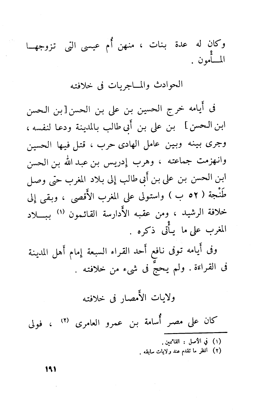 فِي أَيَّامه خرج الْحُسَيْن بن عَليّ بن الْحسن بن الْحسن ابْن الْحسن بن عَليّ بن أبي طَالب بِالْمَدِينَةِ ودعا لنَفسِهِ وَجرى بَينه وَبَين عَامل الهادى حَرْب قتل فِيهَا الْحُسَيْن وانهزمت جماعته وهرب إِدْرِيس بن عبد الله بن الْحسن ابْن الْحسن بن عَليّ بن أبي طَالب إِلَى بِلَاد الْمغرب الْأَقْصَى وبقى إِلَى خلَافَة الرشيد وَمن عقبه الأدارسة القائمون بِبِلَاد الْمغرب على مَا يَأْتِي ذكره