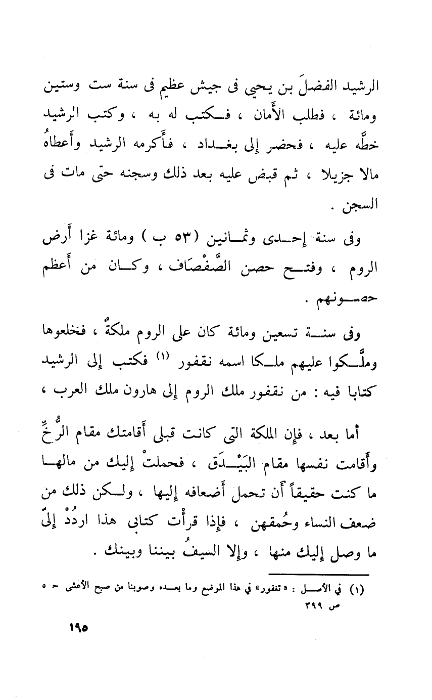 وَفِي سنة تسعين وَمِائَة كَانَ على الرّوم ملكة فخلعوها وملكوا عَلَيْهِم ملكا اسْمه نقفور فَكتب إِلَى الرشيد كتابا فِيهِ من نقفور ملك الرّوم إِلَى هَارُون ملك الْعَرَب أما بعد فَإِن الملكة الَّتِى كَانَت قبلى أقامتك مقَام الرخ وأقامت نَفسهَا مقَام البيدق فَحملت إِلَيْك من مَالهَا مَا كنت حَقِيقا أَن تحمل أضعافه إِلَيْهَا وَلَكِن ذَلِك من ضعف النِّسَاء وحمقهن فَإِذا قَرَأت كتابي هَذَا ارْدُدْ إِلَى مَا وصل إِلَيْك مِنْهَا وَإِلَّا السَّيْف بَيْننَا وَبَيْنك
