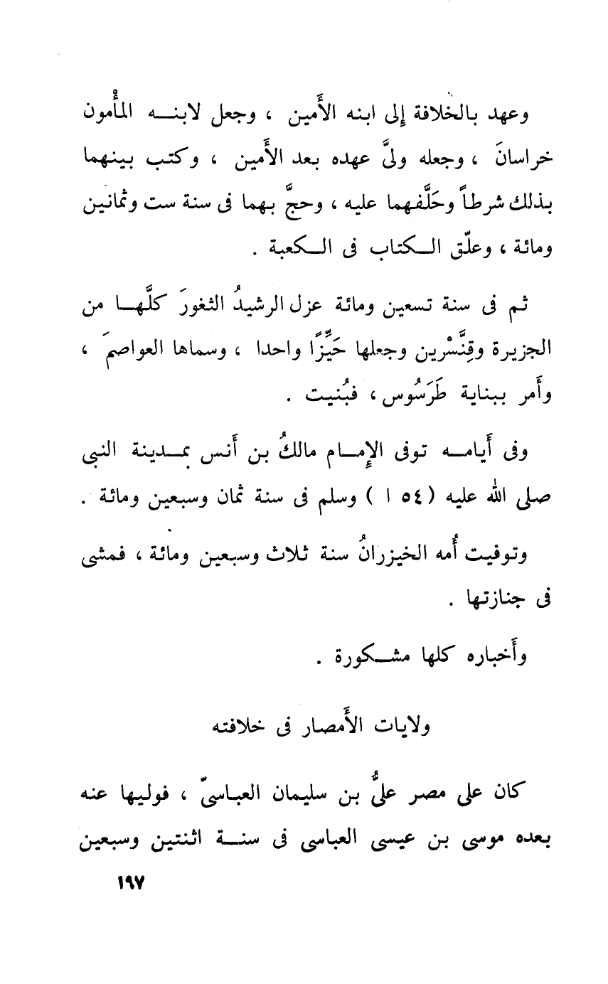 وَفِي أَيَّامه توفى الإِمَام مَالك بن أنس بِمَدِينَة النبى صلى الله عَلَيْهِ (54 أ) وَسلم فِي سنة ثَمَان وَسبعين وَمِائَة