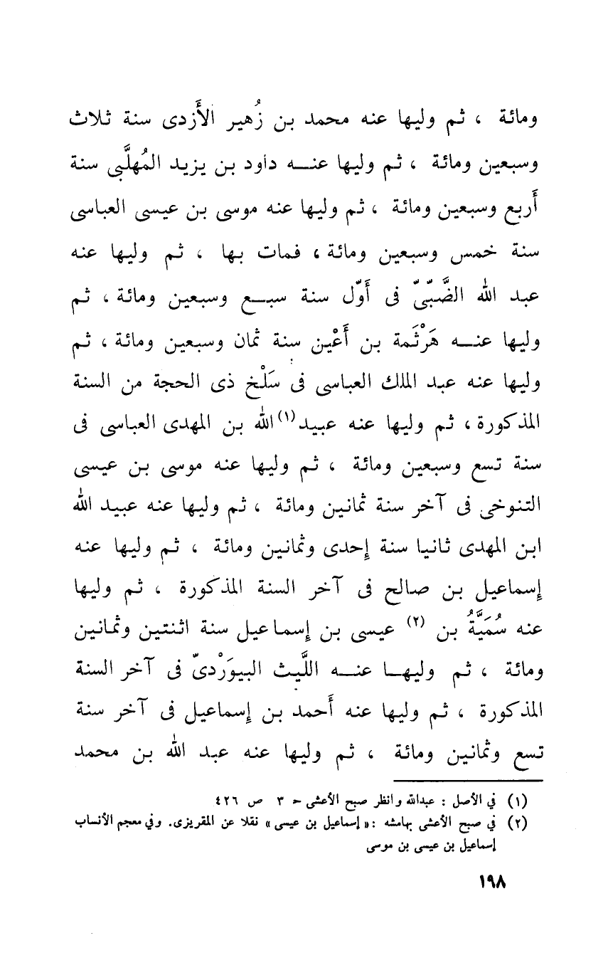 وَمِائَة ثمَّ وَليهَا عَنهُ مُحَمَّد بن زُهَيْر الْأَزْدِيّ سنة ثَلَاث وَسبعين وَمِائَة ثمَّ وَليهَا عَنهُ دَاوُد بن يزِيد المهلبي سنة أبع وَسبعين وَمِائَة ثمَّ وَليهَا عَنهُ مُوسَى بن عِيسَى العباسي سنة خمس وَسبعين وَمِائَة فَمَاتَ بهَا ثمَّ وَليهَا عَنهُ عبد الله الضبى فِي أول سنة سبع وَسبعين وَمِائَة ثمَّ وَليهَا عَنهُ هرثمة بن أعين سنة ثَمَان وَسبعين وَمِائَة ثمَّ وَليهَا عَنهُ عبيد الله بن المهدى العباسى فِي سنة تسع وَسبعين وَمِائَة ثمَّ وَليهَا عَنهُ مُوسَى بن عبيد الله ابْن المهدى ثَانِيًا سنة إِحْدَى وَثَمَانِينَ وَمِائَة ثمَّ وَليهَا عَنهُ إِسْمَاعِيل بن صَالح فِي آخر السّنة الْمَذْكُورَة ثمَّ وَليهَا عَنهُ سميَّة بن عِيسَى بن إِسْمَاعِيل سنة اثْنَتَيْنِ وَثَمَانِينَ وَمِائَة ثمَّ وَليهَا عَنهُ اللَّيْث البيوردي فِي آخر السنه المذكوره ثمَّ وَليهَا عَنهُ أَحْمد بن إِسْمَاعِيل فِي آخر سنة تسع وَثَمَانِينَ وَمِائَة ثمَّ وَليهَا عَنهُ عبد الله بن مُحَمَّد