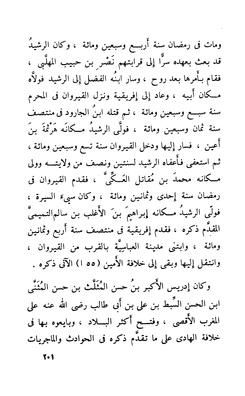 وَمَات فِي رَمَضَان سنة ارْبَعْ وَسبعين وَمِائَة وَكَانَ الرشيد قد بعث بعهده سرا الى قرابتهم نصر بن بيب المهلبي فَقَامَ بأمرها بعد روح وَسَار ابْنه الْفضل الى الرشيد فولاه مَكَان ابيه وَعَاد الى افريقية وَنزل القيروان فِي الْمحرم سنة سبع وَسبعين وَمِائَة ثمَّ قَتله ابْن الْجَارُود فِي منتصف سنة ثَمَان وَسبعين وَمِائَة فولى الرشيد مَكَانَهُ هرثمة بن اعين فَسَار اليها وَدخل القيروان سنة تسع وَسبعين وَمِائَة ثمَّ استعفى فأعفاه الرشيد لِسنتَيْنِ وَنصف من ولَايَته وَولى مَكَانَهُ مُحَمَّد بن مقَاتل العكي فَقدم القيروان فِي رَمَضَان سنة احدى وَثَمَانِينَ وَمِائَة وَكَانَ سيىء السِّيرَة فولى الرشيد مَكَانَهُ ابراهيم بن الاغلب بن سَالم التَّمِيمِي الْمُقدم ذكره فَقدم افريقية فِي منتصف سنة ارْبَعْ وَثَمَانِينَ وَمِائَة وابتنى مَدِينَة العباسية بِالْقربِ من القيروان وانتقل اليها وَبَقِي الى خلَافَة الامين 55 أالاتي ذكره
