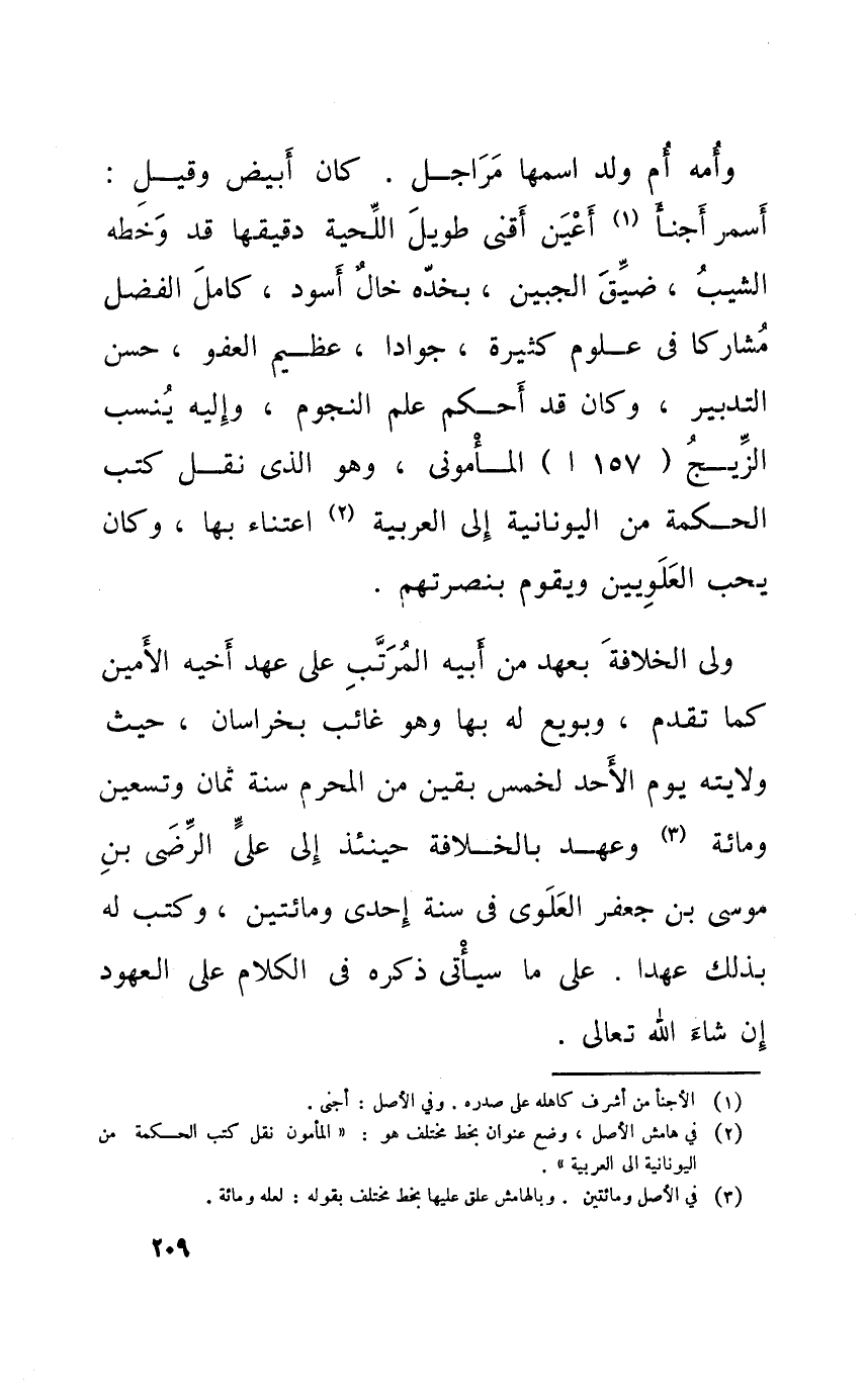 وامه ام ولد اسْمهَا مراجل كَانَ ابيض وَقيل اسمر اجنأ اعين اقنى طَوِيل اللِّحْيَة دقيقها قد وخطه الشيب ضيق الجبين بخده خَال اسود كَامِل الْفضل مشاركا فِي عُلُوم كَثِيرَة جوادا عَظِيم الْعَفو حسن التَّدْبِير وَكَانَ قد احكم علم النُّجُوم واليه ينْسب الزيج 157 أالمأموني وَهُوَ الَّذِي نقل كتب الْحِكْمَة من اليونانية الى الْعَرَبيَّة اعتناء بهَا وَكَانَ يحب العلويين وَيقوم بنصرتهم