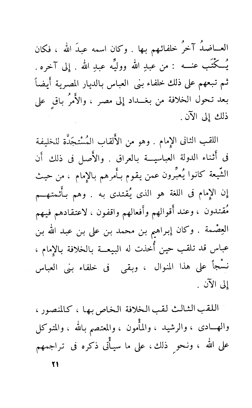 العاضد آخر خلفائهم بهَا وَكَانَ اسْمه عبد الله فَكَانَ يكْتب عَنهُ من عبد الله ووليه عبد الله إِلَى آخِره ثمَّ تَبِعَهُمْ على ذَلِك خلفاء بني الْعَبَّاس بالديار المصرية أَيْضا بعد تحول الْخلَافَة من بَغْدَاد إِلَى مصر وَالْأَمر بَاقٍ على ذَلِك إِلَى الْآن