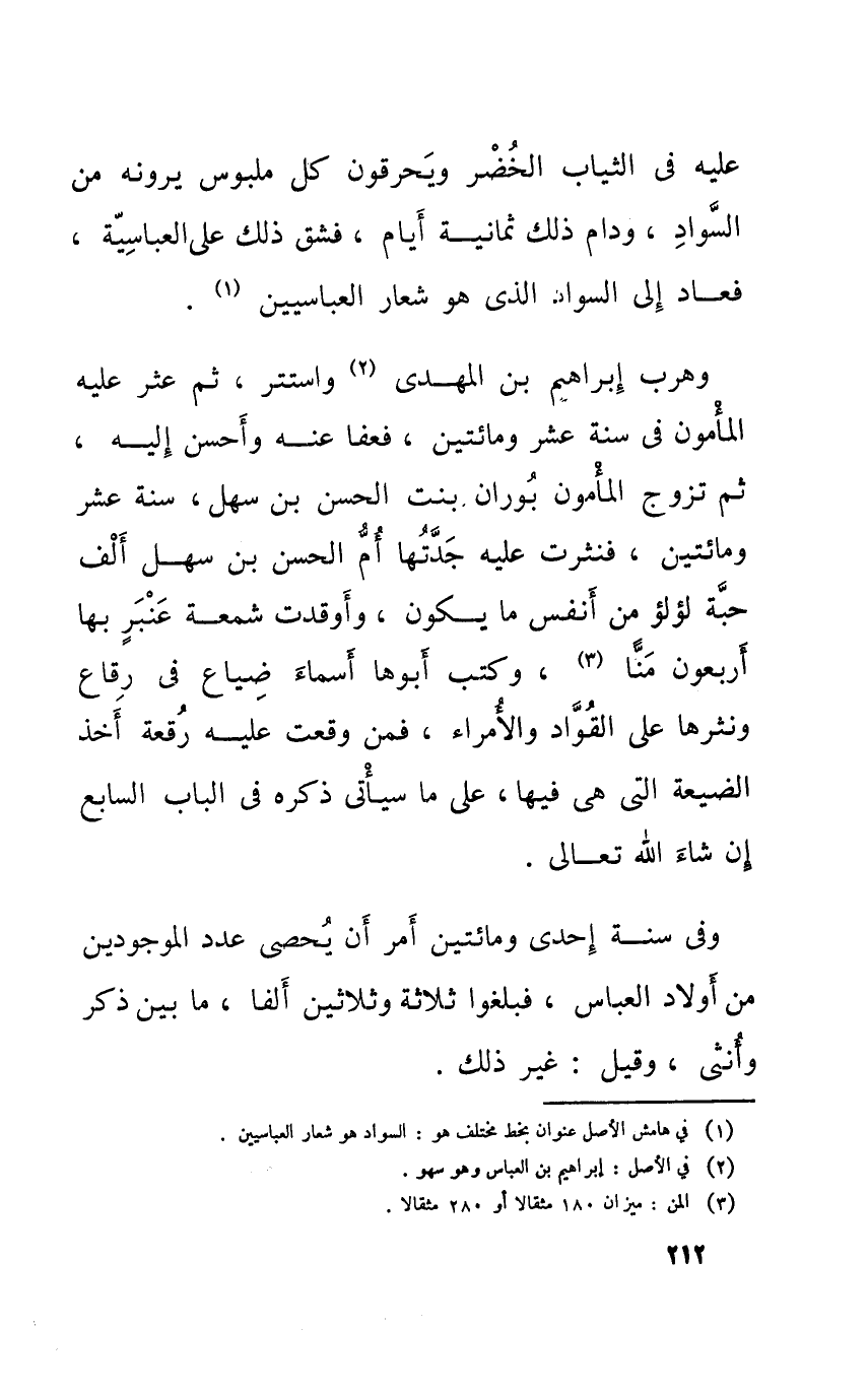 وَفِي سنة احدى وَمِائَتَيْنِ امْر ان يُحْصى عدد الْمَوْجُودين من اولاد الْعَبَّاس فبلغوا ثَلَاثَة وَثَلَاثِينَ الْفَا مَا بَين ذكر وانثى وَقيل غير ذَلِك