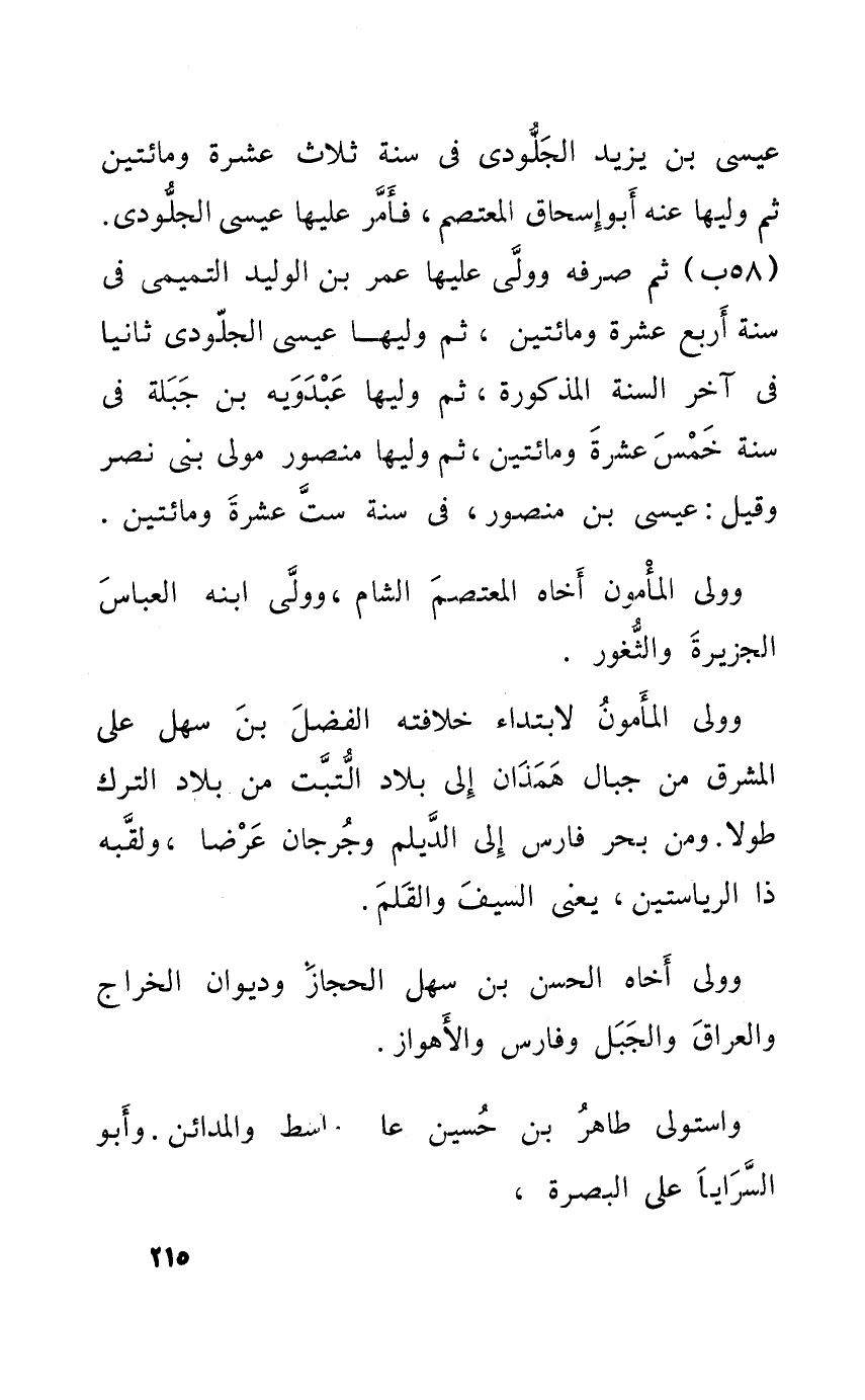 وَولى الْمَأْمُون لابتداء خِلَافَته الْفضل بن سهل على الْمشرق من جبال همذان الى بِلَاد التبت من بِلَاد التّرْك طولا وَمن بَحر فَارس الى الديلم وجرجان عرضا ولقبه ذَا الرياستين يَعْنِي السَّيْف والقلم