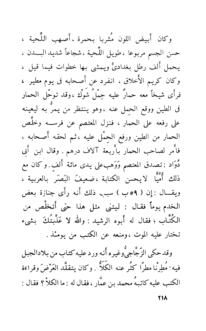 وَكَانَ ابيض اللَّوْن مشربا بحمرة اصهب اللِّحْيَة حسن الْجِسْم مربوعا طَوِيل اللِّحْيَة شجاعا شَدِيد الْبدن يحمل الف رَطْل بغدادي وَيَمْشي بهَا خطوَات فِيمَا قيل وَكَانَ كريم الاخلاق انْفَرد عَن اصحابه فِي يَوْم مطير فَرَأى شَيخا مَعَه حمَار عَلَيْهِ حمل شوك وَقد توحل الْحمار فِي الطين وَوَقع الْحمل عَنهُ وَهُوَ ينْتَظر من يمر بِهِ ليعينه على رَفعه على الْحمار فَنزل المعتصم عَن فرسه وخلص الْحمار من الطين وَرفع الْحمل عَلَيْهِ ثمَّ لحقه اصحابه فَأمر لصَاحب الْحمار بأَرْبعَة الاف دِرْهَم وَقَالَ ابْن ابي دواد تصدق المعتصم ووهب على يَدي مائَة الف وَكَانَ مَعَ ذَلِك اميا لَا يحسن الْكِتَابَة ضَعِيف الْبَصَر بِالْعَرَبِيَّةِ وَيُقَال ان 59 ب سَبَب ذَلِك انه رأى جَنَازَة بعض الخدم يَوْمًا فَقَالَ لَيْتَني مثل هَذَا حَتَّى اتخلص من الْكتاب فَقَالَ لَهُ ابوه الرشيد وَالله لَا عَذَّبْتُك بِشَيْء تخْتَار عَلَيْهِ الْمَوْت وَمنعه عَن الْكتب من يَوْمئِذٍ