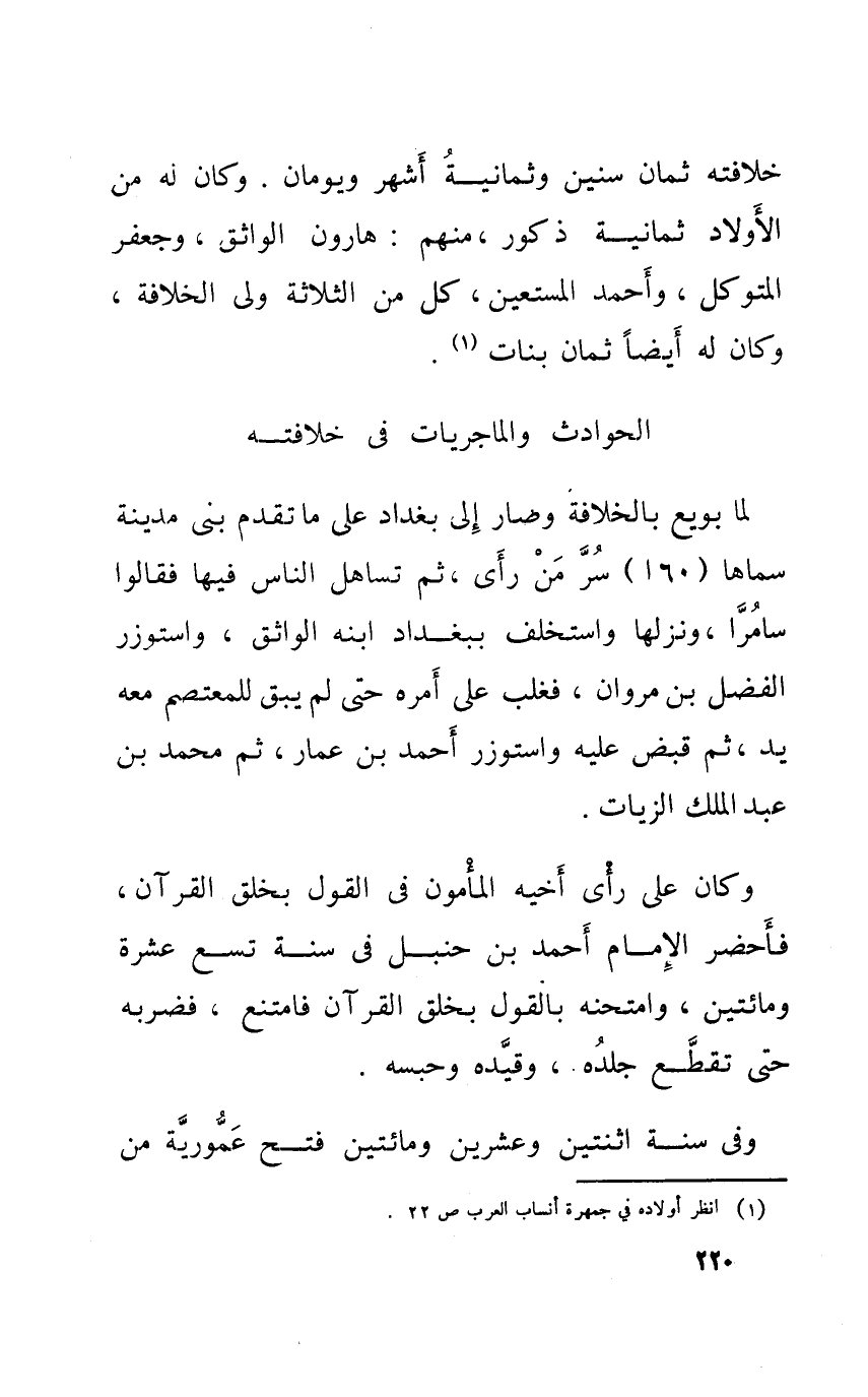 خِلَافَته ثَمَان سِنِين وَثَمَانِية اشهر ويومان وَكَانَ لَهُ من الاولاد ثَمَانِيَة ذُكُور مِنْهُم هَارُون الواثق وجعفر المتَوَكل وَاحْمَدْ المستعين كل من الثَّلَاثَة ولي الْخلَافَة وَكَانَ لَهُ ايضا ثَمَان بَنَات