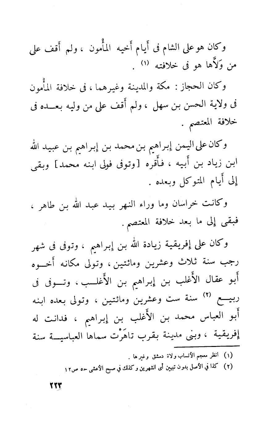 وَكَانَ على إفريقية زِيَادَة الله بن إِبْرَاهِيم وَتوفى فِي شهر رَجَب سنة ثَلَاث وَعشْرين وَمِائَتَيْنِ وَتَوَلَّى مَكَانَهُ أَخُوهُ أَبُو عقال الْأَغْلَب بن إِبْرَاهِيم بن الْأَغْلَب بن إِبْرَاهِيم بن الْأَغْلَب وَتوفى فِي ربيع سنة سِتّ وَعشْرين وَمِائَتَيْنِ وَتَوَلَّى بعده ابْنه أَبُو الْعَبَّاس مُحَمَّد بن الْأَغْلَب بن إِبْرَاهِيم فدانت لَهُ إفريقية وَبنى مَدِينَة بِقرب تاهرت سَمَّاهَا العباسية سنة