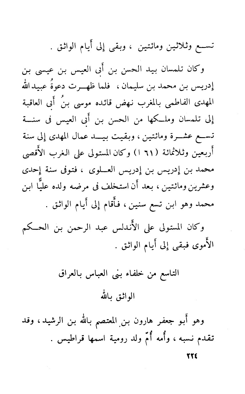 وَكَانَ تلمسان بيد الْحسن بن أبي العيس بن عِيسَى بن إِدْرِيس بن مُحَمَّد بن سُلَيْمَان فَلَمَّا ظَهرت دَعْوَة عبيد الله المهدى الفاطمي بالمغرب نَهَضَ قائده مُوسَى بن أبي الْعَاقِبَة إِلَى تلمسان وملكها من الْحسن بن أبي العيس فِي سنة تسع عشرَة وَمِائَتَيْنِ وَبقيت بيد عُمَّال المهدى إِلَى سنة أَرْبَعِينَ وثلاثمائة (61 أ) وَكَانَ المستولى على الْمغرب الْأَقْصَى مُحَمَّد بن إِدْرِيس بن إِدْرِيس العلوى فتوفى سنة إِحْدَى وَعشْرين وَمِائَتَيْنِ بعد أَن اسْتخْلف فِي مَرضه وَلَده عليا ابْن مُحَمَّد وَهُوَ ابْن تسع سِنِين فَأَقَامَ إِلَى إيام الواثق