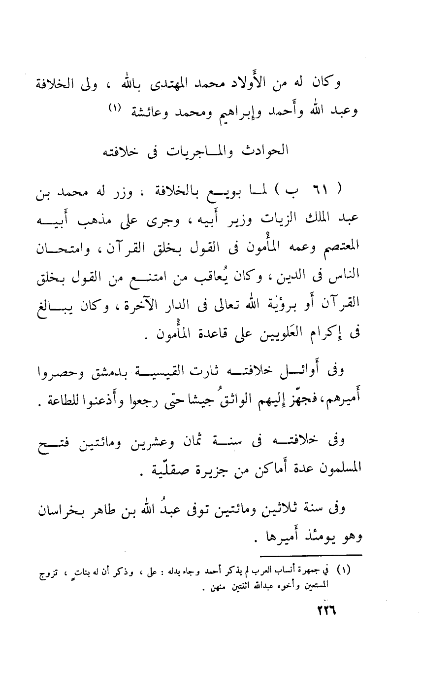 (61 ب) لما بُويِعَ بالخلافة وزر لَهُ مُحَمَّد بن عبد الْملك الزيات وَزِير أَبِيه وَجرى على مَذْهَب أَبِيه المعتصم وَعَمه الْمَأْمُون فِي القَوْل بِخلق الْقُرْآن وامتحان النَّاس فِي الدّين وَكَانَ يُعَاقب من امْتنع من القَوْل بِخلق الْقُرْآن أَو بِرُؤْيَة الله تَعَالَى فِي الدَّار الْآخِرَة وَكَانَ يُبَالغ فِي إكرام العلويين على قَاعِدَة الْمَأْمُون