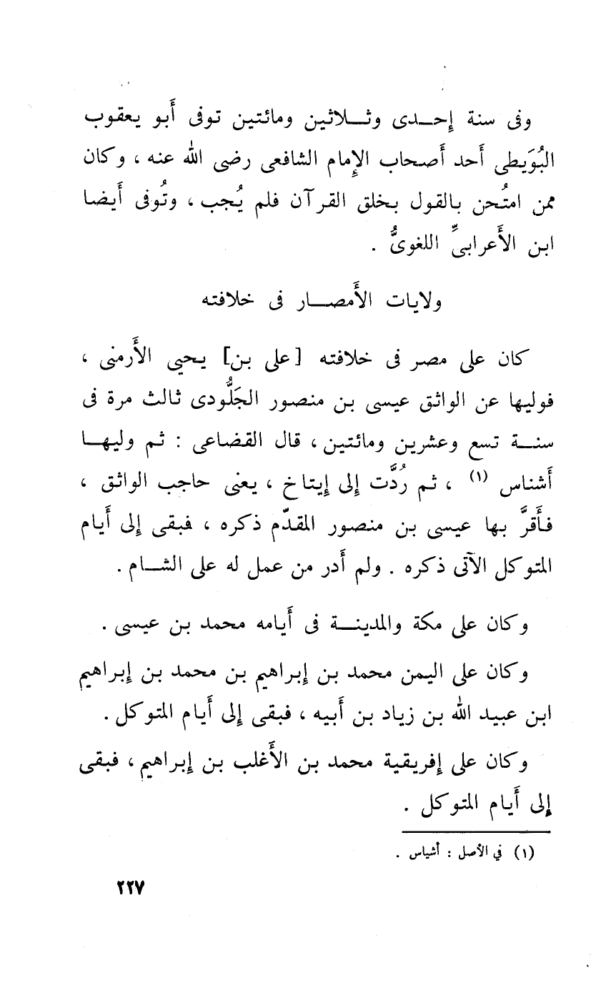 وَفِي سنة إِحْدَى وَثَلَاثِينَ وَمِائَتَيْنِ توفّي أَبُو يَعْقُوب الْبُوَيْطِيّ أحد أَصْحَاب الإِمَام الشَّافِعِي رَضِي الله عَنهُ وَكَانَ مِمَّن امتحن بالْقَوْل بِخلق الْقُرْآن فَلم يجب وَتُوفِّي أَيْضا ابْن الْأَعرَابِي اللّغَوِيّ