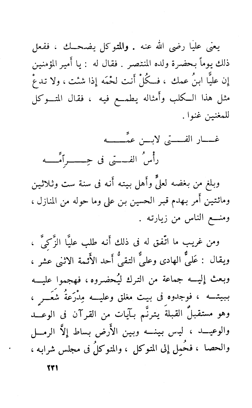 يعْنى عليا رضى الله عَنهُ والمتوكل يضْحك فَفعل ذَلِك يَوْمًا بِحَضْرَة وَلَده الْمُنْتَصر فَقَالَ لَهُ يَا أَمِير الْمُؤمنِينَ إِن عليا ابْن عمك فَكل أَنْت لَحْمه إِذا شِئْت وَلَا تدع مثل هَذَا الْكَلْب وَأَمْثَاله يطْمع فِيهِ فَقَالَ المتَوَكل للمغنين غنوا ... غَار الْفَتى لِابْنِ عَمه ... رَأس الْفَتى فِي حرَامه ...