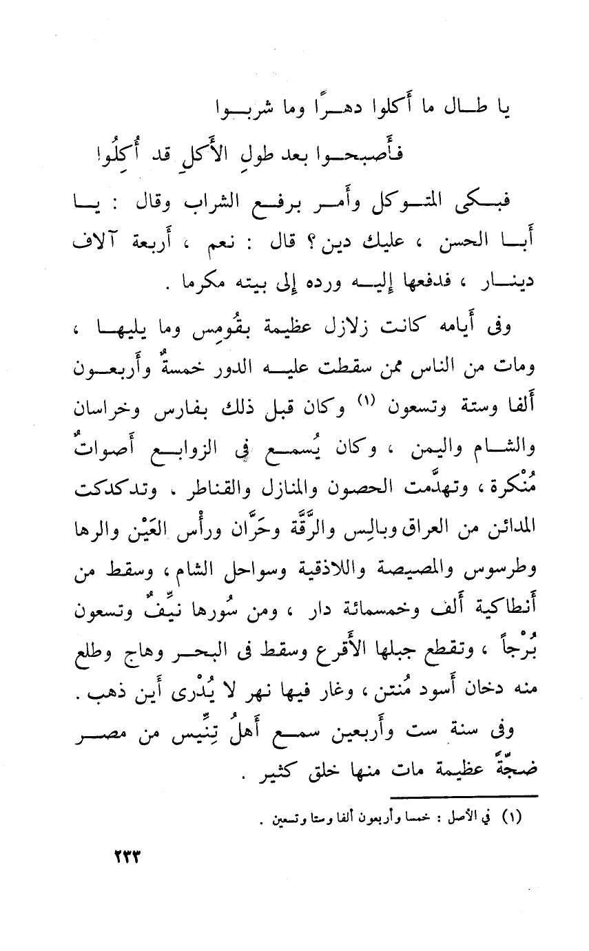 وَفِي أَيَّامه كَانَت زلازل عَظِيمَة بقومس وَمَا يَليهَا وَمَات من النَّاس مِمَّن سَقَطت عَلَيْهِ الدّور خَمْسَة وَأَرْبَعُونَ ألفا وَسِتَّة وَتسْعُونَ وَكَانَ قبل ذَلِك بِفَارِس وخارسان وَالشَّام واليمن وَكَانَ يسمع فِي الزوابع أصوات ومنكرة وتهدمت الْحُصُون والمنازل والقناطر وتدكدكت الْمَدَائِن من الْعرَاق وبالس والرقة وحران وَرَأس الْعين والرها وطرسوس والمصيصة واللاذقية وسواحل الشَّام وَسقط من أنطاكية ألف وَخَمْسمِائة دَار وَمن سورها نَيف وَتسْعُونَ برجا وتقطع جبلها الْأَقْرَع وَسقط فِي الْبَحْر وهاج وطلع مِنْهُ دُخان أسود منتن وغار فِيهَا نهر لَا يدرى أَيْن ذهب