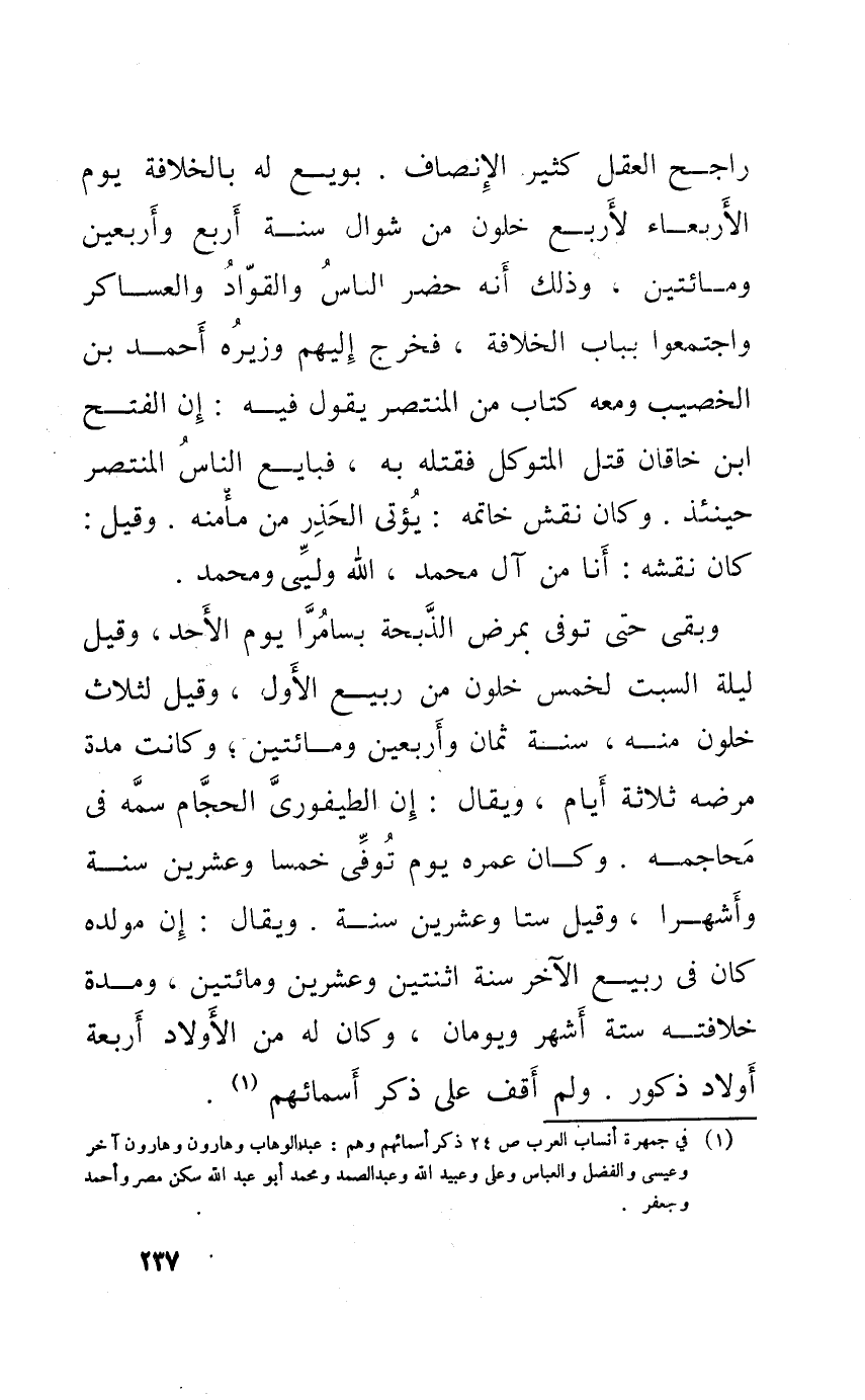 وبقى حَتَّى توفى بِمَرَض الذبْحَة بسامر يَوْم الْأَحَد وَقيل لَيْلَة السبت لخمس خلون من ربيع الأول وَقيل لثلاث خلون مِنْهُ سنة ثَمَان وَأَرْبَعين وَمِائَتَيْنِ وَكَانَت مُدَّة مَرضه ثَلَاثَة أَيَّام وَيُقَال إِن الطيفورى الْحجام سمه فِي محاجمه وَكَانَ عمره يَوْم توفى خمْسا وَعشْرين سنة وأشهرا وَقيل سِتا وَعشْرين سنة وَيُقَال إِن مولده كَانَ فِي ربيع الآخر سنة اثْنَتَيْنِ وَعشْرين وَمِائَتَيْنِ وَمُدَّة خِلَافَته سِتَّة أشهر ويومان وَكَانَ لَهُ من الْأَوْلَاد أَرْبَعَة أَوْلَاد ذُكُور وَلم أَقف على ذكر أسمائهم