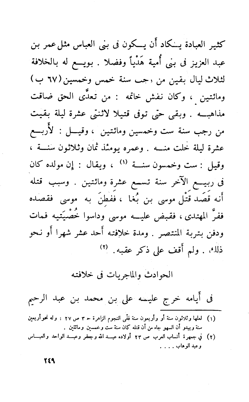 كثير الْعِبَادَة يكَاد أَن يكون فِي بنى الْعَبَّاس مثل عمر بن عبد الْعَزِيز فِي بنى أُميَّة هَديا وفضلا بُويِعَ لَهُ بالخلافة لثلاث لَيَال بَقينَ من رَجَب سنة خمس وَخمسين (67 ب) وَمِائَتَيْنِ وَكَانَ نقش خَاتِمَة من تعدى الْحق ضَاقَتْ مذاهبه وبقى حَتَّى توفى قَتِيلا لاثنتى عشرَة لَيْلَة بقيت من رَجَب سنة سِتّ وَخمسين وَمِائَتَيْنِ وَقيل لأَرْبَع عشرَة لَيْلَة خلت مِنْهُ وعمره يَوْمئِذٍ ثَمَان وَثَلَاثُونَ سنة وَقيل سِتّ وَخَمْسُونَ سنة وَيُقَال إِن مولده كَانَ فِي ربيع الآخر سنة تسع عشرَة وَمِائَتَيْنِ وَسبب قَتله أَنه قصد قتل مُوسَى بن بغا فَفطن بِهِ مُوسَى فقصده ففر المهتدى فَقبض عَلَيْهِ مُوسَى وداسوا خصيتيه فَمَاتَ وَدفن بتربة الْمُنْتَصر وَمُدَّة خِلَافَته أحد عشر شهرا أَو نَحْو ذَلِك وَلم أَقف على ذكر عقبه