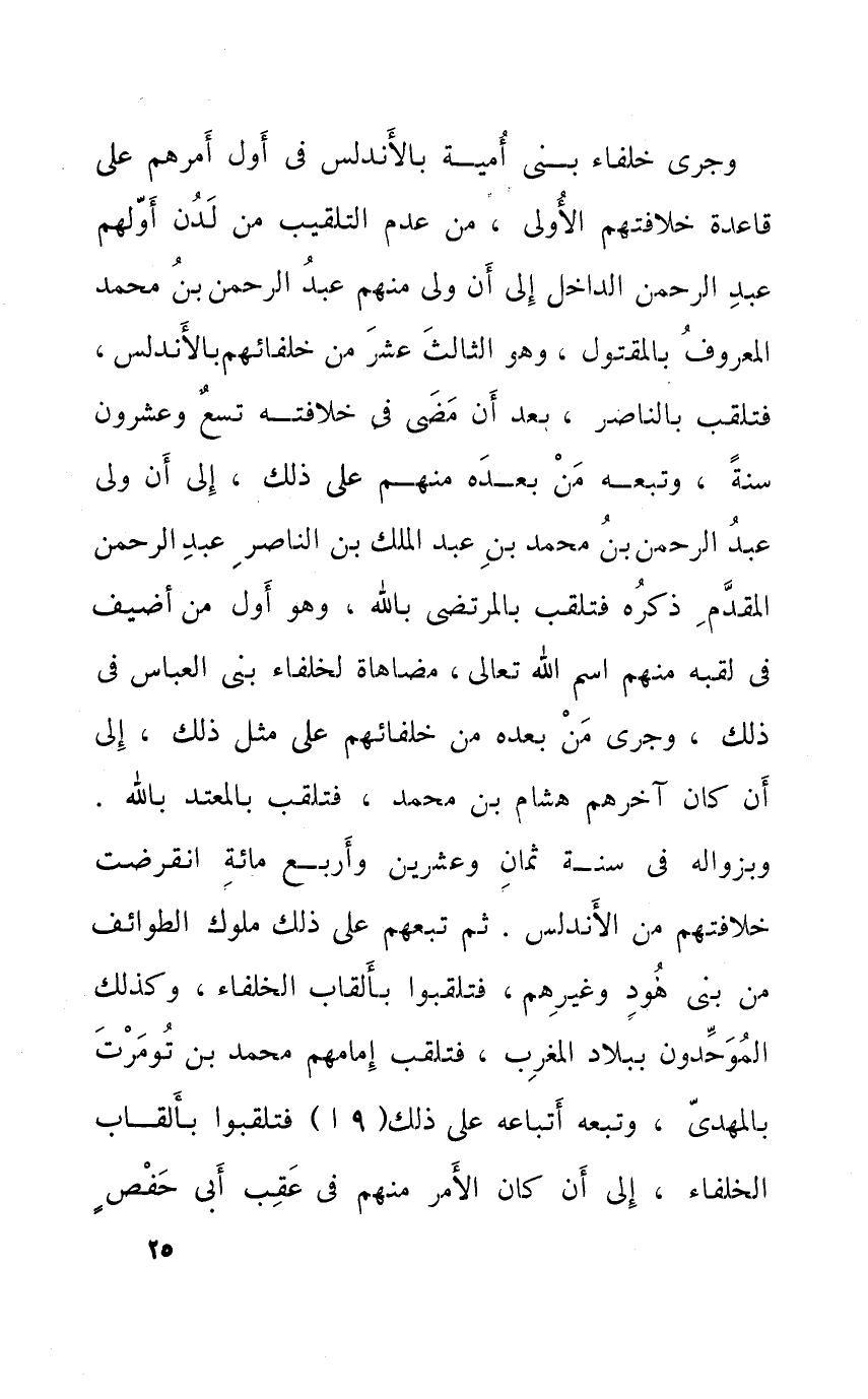 وَجرى خلفاء بنى أُميَّة بالأندلس فِي أول أَمرهم على قَاعِدَة خلافتهم الأولى من عدم التلقيب من لدن أَوَّلهمْ عبد الرَّحْمَن الدَّاخِل إِلَى أَن ولى مِنْهُم عبد الرَّحْمَن بن مُحَمَّد الْمَعْرُوف بالمقتول وَهُوَ الثَّالِث عشر من خلفائهم بالأندلس فتلقب بالناصر بعد أَن مضى فِي خِلَافَته تسع وَعِشْرُونَ سنة وَتَبعهُ من بعده مِنْهُم على ذَلِك إِلَى أَن ولى عبد الرَّحْمَن بن مُحَمَّد بن عبد الْملك بن النَّاصِر عبد الرَّحْمَن الْمُقدم ذكره فتلقب بالمرتضى بِاللَّه وَهُوَ أول من أضيف فِي لقبه مِنْهُم اسْم الله تَعَالَى مضاهاة لخلفاء بنى الْعَبَّاس فِي ذَلِك وَجرى من بعده من خلفائهم على مثل ذَلِك إِلَى ان كَانَ آخِرهم هِشَام بن مُحَمَّد فتلقب بالمعتد بِاللَّه وبزواله فِي سنة ثَمَان وَعشْرين وَأَرْبع مائَة انقرضت خلافتهم من الأندلس ثمَّ تَبِعَهُمْ على ذَلِك مُلُوك الطوائف من بنى هود وَغَيرهم فتلقبوا بألقاب الْخُلَفَاء وَكَذَلِكَ الموحدون بِبِلَاد الْمغرب فتلقب إمَامهمْ مُحَمَّد بن تومرت بالمهدى وَتَبعهُ أَتْبَاعه على ذَلِك (9 أ) فتلقبوا بألقاب الْخُلَفَاء إِلَى أَن كَانَ الْأَمِير مِنْهُم فِي عقب أبي حَفْص