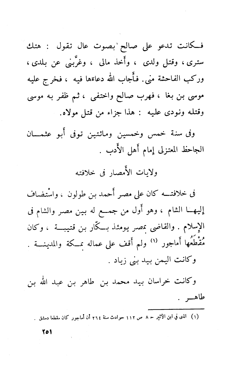 فَكَانَت تَدْعُو على صَالح بِصَوْت عَال تَقول هتك سترى وَقتل ولدى وَأخذ مالى وغربنى عَن بلدى وَركب الْفَاحِشَة منى فَأجَاب الله دعاءها فِيهِ فَخرج عَلَيْهِ مُوسَى بن بغا فهرب صَالح واختفى ثمَّ ظفر بِهِ مُوسَى وَقَتله ونودى عَلَيْهِ هَذَا جَزَاء من قتل مَوْلَاهُ
