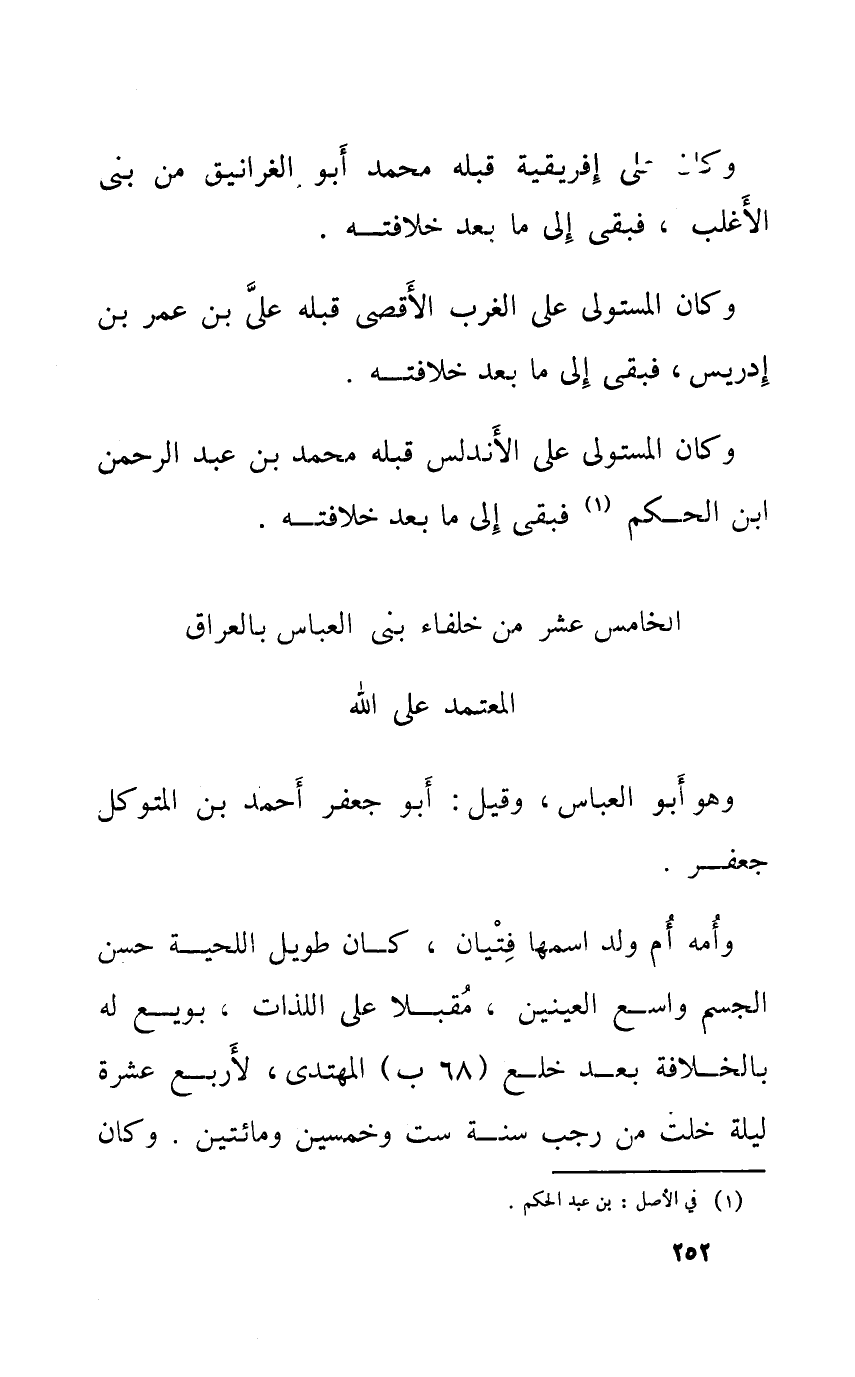 وامه ام ولد اسْمهَا فتيَان كَانَ طَوِيل اللِّحْيَة حسن الْجِسْم وَاسع الْعَينَيْنِ مُقبلا على اللَّذَّات بُويِعَ لَهُ بالخلافة بعد خلع 68 ب الْمُهْتَدي لاربع عشرَة لَيْلَة خلت من رَجَب سنة سِتّ وَخمسين وَمِائَتَيْنِ وَكَانَ