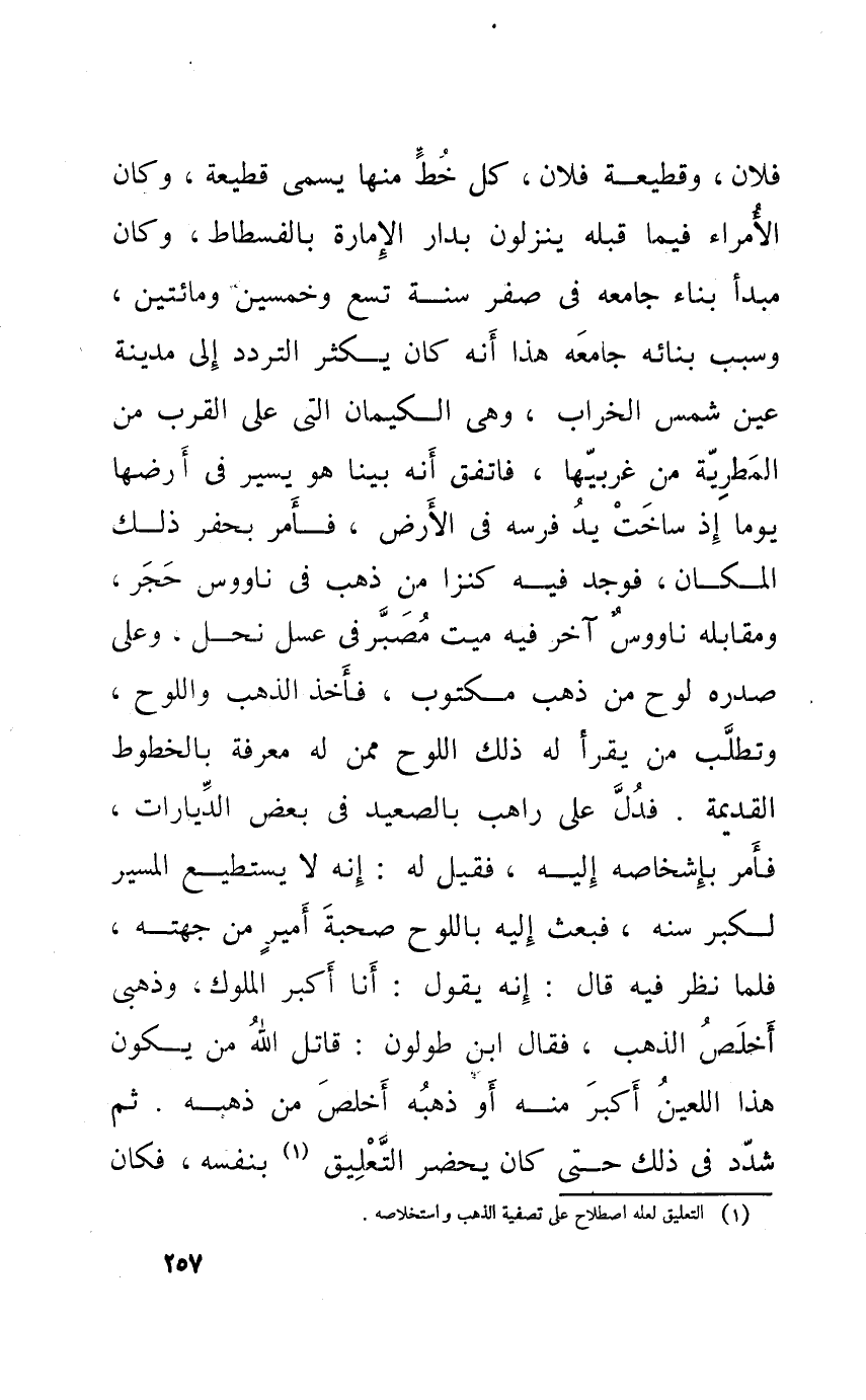 فلَان وَقَطِيعَة فلَان كل خطّ مِنْهَا يُسمى قطيعة وَكَانَ الامراء فِيمَا قبله ينزلون بدار الامارة بالفسطاط وَكَانَ مبدأ بِنَاء جَامعه فِي صفر سنة تسع وَخمسين وَمِائَتَيْنِ وَسبب بنائِهِ جَامعه هَذَا انه كَانَ يكثر التَّرَدُّد الى مَدِينَة عين شمس الخراب وَهِي الكيمان الَّتِي على الْقرب من المطرية من غربيها فاتفق انه بَينا هُوَ يسير فِي أرْضهَا يَوْمًا اذ ساخت يَد فرسه فِي الارض فَأمر بِحَفر ذَلِك الْمَكَان فَوجدَ فِيهِ كنزا من ذهب فِي ناووس حجر وَمُقَابِله ناووس اخر فِيهِ ميت مصبر فِي عسل نحل وعَلى صَدره لوح من ذهب مَكْتُوب فَأخذ الذَّهَب واللوح وتطلب من يقْرَأ لَهُ ذَلِك اللَّوْح مِمَّن لَهُ معرفَة بالخطوط الْقَدِيمَة فَدلَّ على رَاهِب بالصعيد فِي بعض الديارات فَأمر باشخاصه اليه فَقيل لَهُ انه لَا يَسْتَطِيع الْمسير لكبر سنه فَبعث اليه باللوح صُحْبَة امير من جِهَته فَلَمَّا نظر فِيهِ قَالَ انه يَقُول انا اكبر الْمُلُوك وذهبي اخلص الذَّهَب فَقَالَ ابْن طولون قَاتل الله من يكون هَذَا اللعين اكبر مِنْهُ اَوْ ذهبه اخلص من ذهبه ثمَّ شدد فِي ذَلِك حَتَّى كَانَ يحضر التَّعْلِيق بِنَفسِهِ فَكَانَ