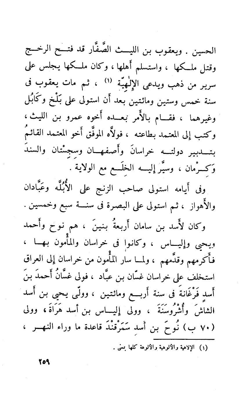 وَكَانَ لأسد بن سامان أَرْبَعَة بَنِينَ هم نوح وَأحمد ويحي وإلياس وَكَانُوا فِي خرسان والمأمون بهَا فأكرمهم وَقَدَّمَهُمْ وَلما سَار الْمَأْمُون من خُرَاسَان إِلَى الْعرَاق اسْتخْلف على خرسان غَسَّان بن عباد فولى غَسَّان أَحْمد بن أَسد فرغانة فِي سنة أَربع وَمِائَتَيْنِ وَولى يحيى بن أَسد الشاش وأشروسنة وَولى إلْيَاس بن أَسد هراة وَولى (70 ب) نوح بن أَسد سَمَرْقَنْد قَاعِدَة مَا وَرَاء النَّهر