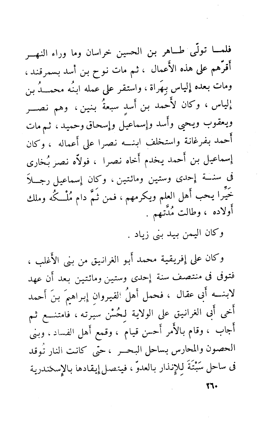فَلَمَّا تولى طَاهِر بن الْحُسَيْن خُرَاسَان وَمَا وَرَاء النَّهر أقرهم على هَذِه الْأَعْمَال ثمَّ مَاتَ نوح بن أَسد بسمرقند وَمَات بعده إلْيَاس بهراة وَاسْتقر على عمله ابْنه مُحَمَّد بن إلْيَاس وَكَانَ لِأَحْمَد بن أَسد سَبْعَة بَنِينَ وهم نصر وَيَعْقُوب وَيحيى وَأسد وَإِسْمَاعِيل وَإِسْحَاق وَحميد ثمَّ مَاتَ أَحْمد بفرغانة واستخلف ابْنه نصرا على أَعماله وَكَانَ إِسْمَاعِيل بن أَحْمد يخْدم أَخَاهُ نصرا فولاه نصر بُخَارى فِي سنة إِحْدَى وَسِتِّينَ وَمِائَتَيْنِ وَكَانَ إِسْمَاعِيل رجلا خيرا يحب أهل الْعلم ويكرمهم فَمن ثمَّ دَامَ ملكه وَملك أَوْلَاده ووطالت مدتهم