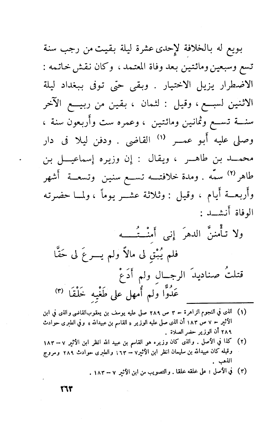 بُويِعَ لَهُ بالخلافة لإحدى عشرَة لَيْلَة بقيت من رَجَب سنة تسع وَسبعين وَمِائَتَيْنِ بعد وَفَاة الْمُعْتَمد وَكَانَ نقش خَاتمه الِاضْطِرَار يزِيل الِاخْتِيَار وبقى حَتَّى توفى بِبَغْدَاد لَيْلَة الِاثْنَيْنِ لسبع وَقيل لثمان بَقينَ من ربيع الآخر سنة تسع وَثَمَانِينَ وَمِائَتَيْنِ وعمره سِتّ وَأَرْبَعُونَ سنة وَصلى عَلَيْهِ أَبُو عمر القاضى وَدفن لَيْلًا فِي دَار مُحَمَّد بن طَاهِر وَيُقَال إِن وزيره إِسْمَاعِيل بن طَاهِر سمه وَمُدَّة خِلَافَته تسع سِنِين وَتِسْعَة أشهر وَأَرْبَعَة أَيَّام وَقيل وَثَلَاثَة عشر يَوْمًا وَلما حَضرته الْوَفَاة أنْشد ... وَلَا تأمنن الدَّهْر إنى أمنته ... فَلم يبْق لى مَالا وَلم يرع لى حَقًا ... قتلت صَنَادِيد الرِّجَال وَلم أدع ... عدوا وَلم أمْهل على طغيه خلقا ...