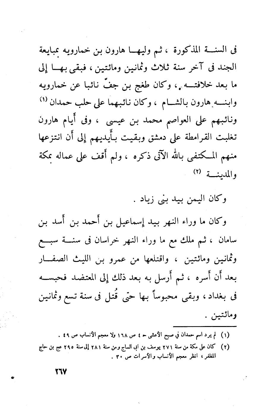 فِي السّنة الْمَذْكُورَة ثمَّ وَليهَا هَارُون بن خمارويه بمبايعة الْجند فِي آخر سنة ثَلَاث وَثَمَانِينَ وَمِائَتَيْنِ فبقى بهَا إِلَى مَا بعد خِلَافَته وَكَانَ طغج بن جف نَائِبا عَن خمارويه وَابْنه هَارُون بِالشَّام وَكَانَ نائبهما على حلب حمدَان ونائبهم على العواصم مُحَمَّد بن عِيسَى وَفِي أَيَّام هَارُون تغلبت القرامطة على دمشق وَبقيت بِأَيْدِيهِم إِلَى أَن انتزعها مِنْهُم المكتفى بِاللَّه الآتى ذكره وَلم أَقف على عماله بِمَكَّة وَالْمَدينَة