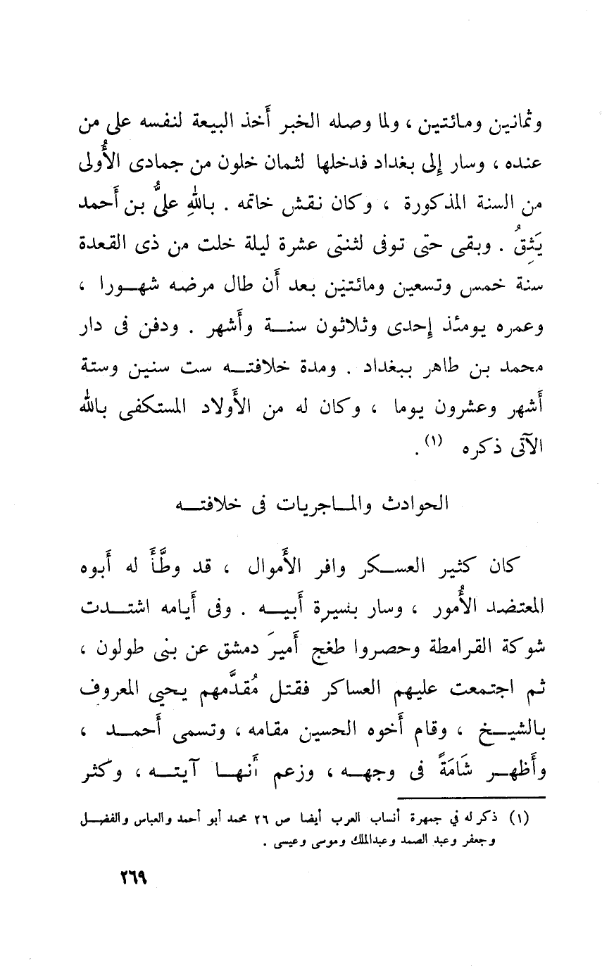 كَانَ كثير الْعَسْكَر وافر الْأَمْوَال قد وطأ لَهُ أَبوهُ المعتضد الْأُمُور وَسَار بسيرة أَبِيه وَفِي أَيَّامه اشتدت شَوْكَة القرامطة وحصروا طغج أَمِير دمشق عَن بنى طولون ثمَّ اجْتمعت عَلَيْهِم العساكر فَقتل مقدمهم يحيى الْمَعْرُوف بالشيخ وَأقَام أَخُوهُ الْحُسَيْن مقَامه وَتسَمى أَحْمد وَأظْهر شامة فِي وَجهه وَزعم أَنَّهَا آتِيَة وَكثر