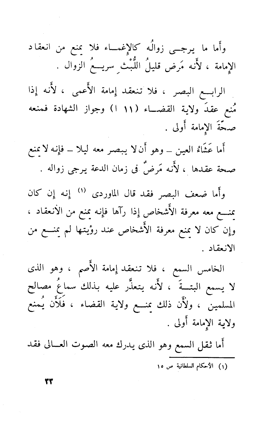 الرَّابِع الْبَصَر فَلَا تَنْعَقِد إِمَامَة الْأَعْمَى لِأَنَّهُ إِذا منع عقد ولَايَة الْقَضَاء (11 ب) وَجَوَاز الشَّهَادَة فَمَنعه صِحَة الْإِمَامَة أولى