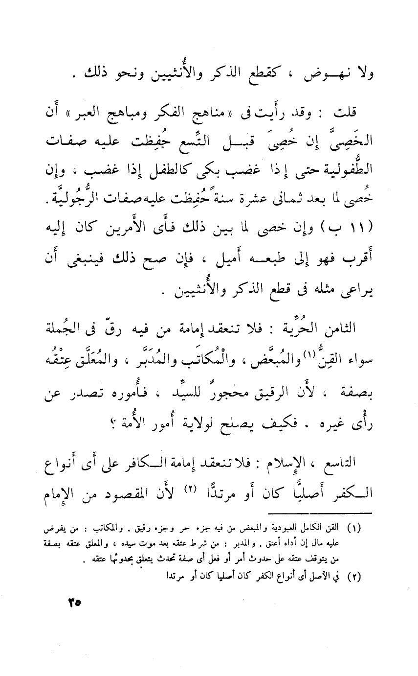 قلت وَقد رَأَيْت فِي مناهج الْفِكر ومباهج العبر أَن الْخصي إِن خصي قبل التسع حفظت عَلَيْهِ صِفَات الطفولية حَتَّى إِذا غضب بَكَى كالطفل إِذا غضب وَإِن خصي لما بعد ثَمَانِي عشرَة سنة حفظت عَلَيْهِ صِفَات الرجولية (11 ب) وَإِن خصي لما بَين ذَلِك فَأَي الْأَمريْنِ كَانَ إِلَيْهِ أقرب فَهُوَ إِلَى طبعه أميل فَإِن صَحَّ ذَلِك فَيَنْبَغِي أَن يُرَاعِي مثله فِي قطع الذّكر والأنثيين