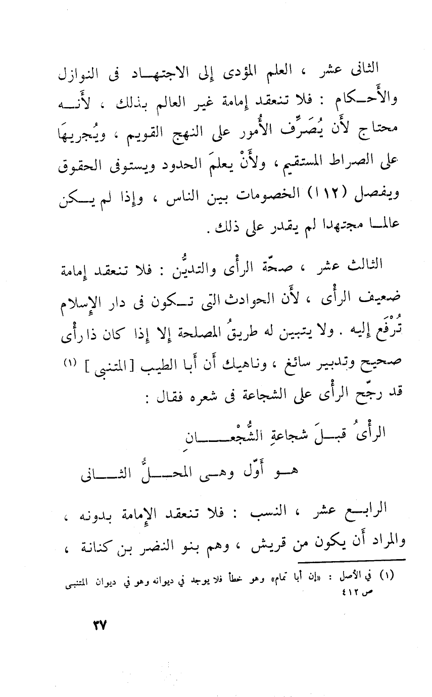 الثَّانِي عشر الْعلم الْمُؤَدى إِلَى الإجتهاد فِي النَّوَازِل وَالْأَحْكَام فَلَا تَنْعَقِد إِمَامَة غير الْعَالم بذلك لِأَنَّهُ مُحْتَاج لِأَن يصرف الْأُمُور على النهج القويم ويجريها على الصِّرَاط الْمُسْتَقيم وَلِأَن يعلم الْحُدُود ويستوفى الْحُقُوق ويفصل (12 أ) الْخُصُومَات بَين النَّاس وَإِذا لم يكن عَالما مُجْتَهدا لم يقدر على ذَلِك